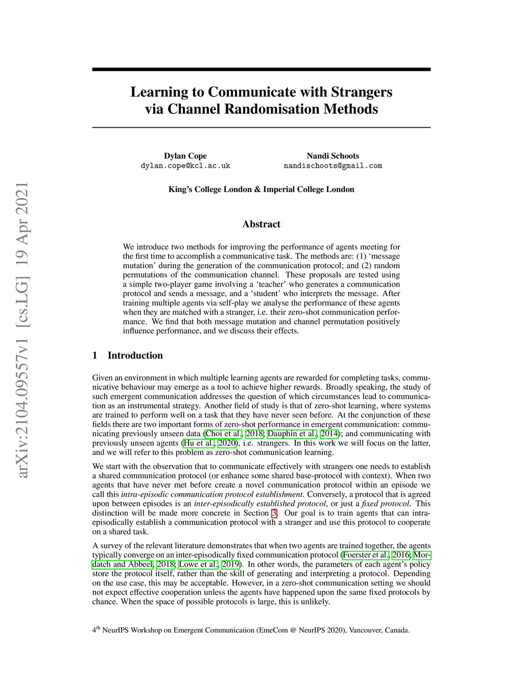 We introduce two methods for improving the performance of agents meeting for the first time to accomplish a communicative task. The methods are: (1) `message mutation' during the generation of the communication protocol; and (2) random permutations of the communication channel. These proposals are tested using a simple two-player game involving a `teacher' who generates a communication protocol and sends a message, and a `student' who interprets the message. After training multiple agents via self-play we analyse the performance of these agents when they are matched with a stranger, i.e. their zero-shot communication performance. We find that both message mutation and channel permutation positively influence performance, and we discuss their effects.