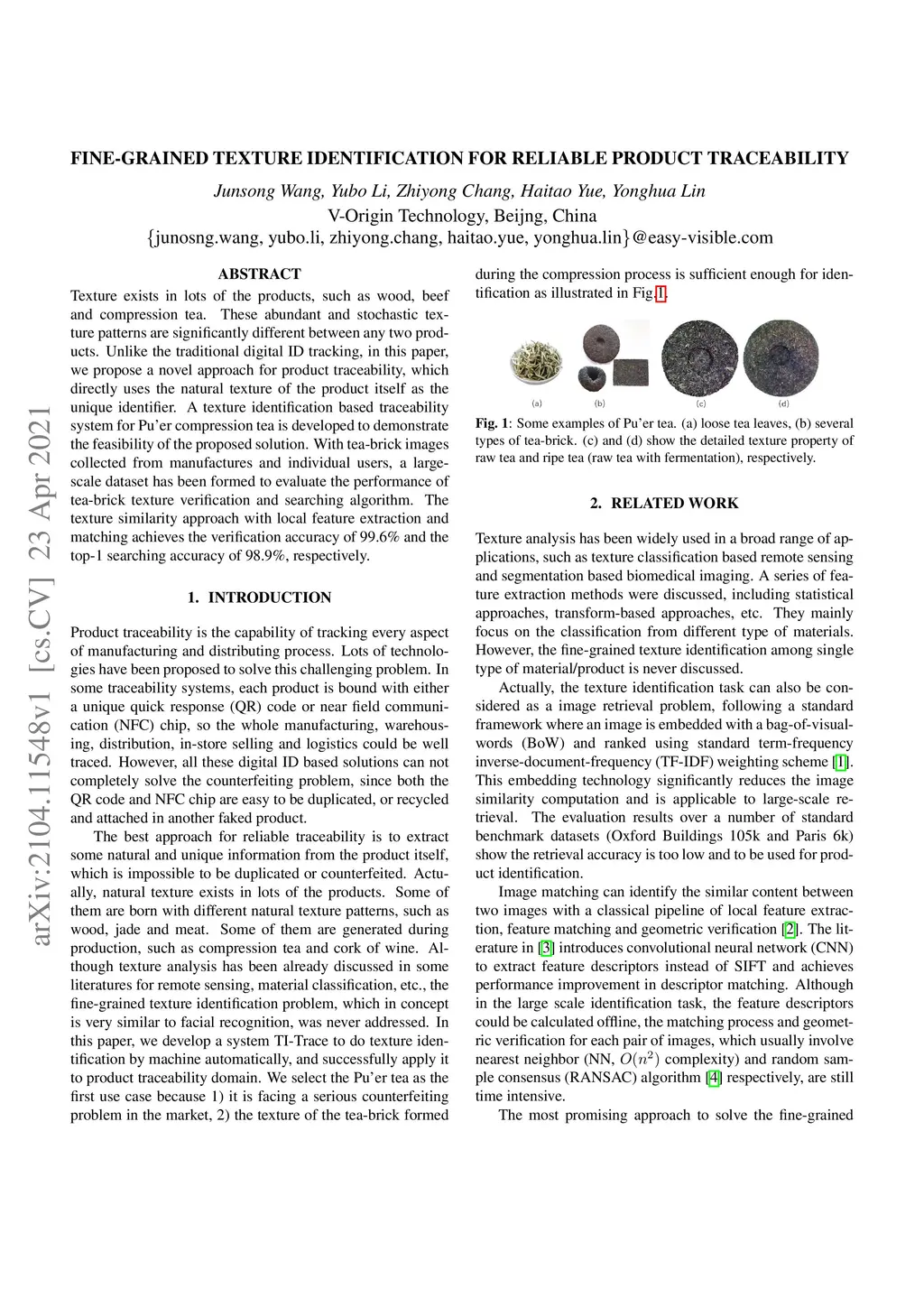 Texture exists in lots of the products, such as wood, beef and compression tea. These abundant and stochastic texture patterns are significantly different between any two products. Unlike the traditional digital ID tracking, in this paper, we propose a novel approach for product traceability, which directly uses the natural texture of the product itself as the unique identifier. A texture identification based traceability system for Puér compression tea is developed to demonstrate the feasibility of the proposed solution. With tea-brick images collected from manufactures and individual users, a large-scale dataset has been formed to evaluate the performance of tea-brick texture verification and searching algorithm. The texture similarity approach with local feature extraction and matching achieves the verification accuracy of 99.6% and the top-1 searching accuracy of 98.9%, respectively.
