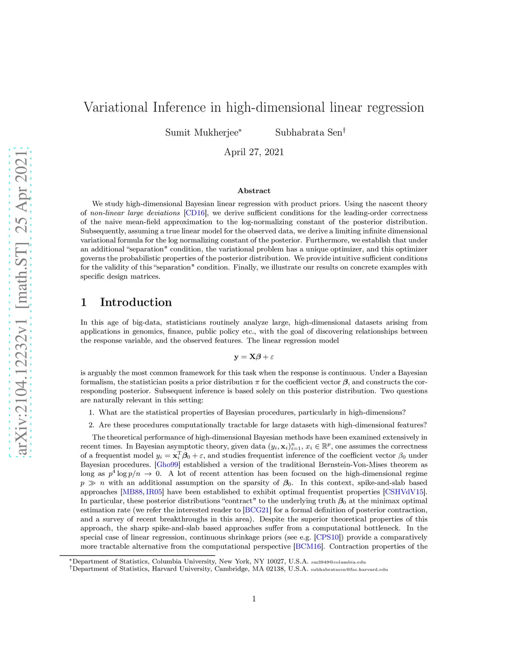 We study high-dimensional Bayesian linear regression with product priors. Using the nascent theory of non-linear large deviations (Chatterjee and Dembo,2016), we derive sufficient conditions for the leading-order correctness of the naive mean-field approximation to the log-normalizing constant of the posterior distribution. Subsequently, assuming a true linear model for the observed data, we derive a limiting infinite dimensional variational formula for the log normalizing constant of the posterior. Furthermore, we establish that under an additional "separation" condition, the variational problem has a unique optimizer, and this optimizer governs the probabilistic properties of the posterior distribution. We provide intuitive sufficient conditions for the validity of this "separation" condition. Finally, we illustrate our results on concrete examples with specific design matrices.