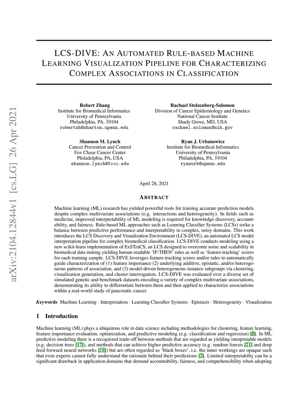 Machine learning (ML) research has yielded powerful tools for training accurate prediction models despite complex multivariate associations (e.g. interactions and heterogeneity). In fields such as medicine, improved interpretability of ML modeling is required for knowledge discovery, accountability, and fairness. Rule-based ML approaches such as Learning Classifier Systems (LCSs) strike a balance between predictive performance and interpretability in complex, noisy domains. This work introduces the LCS Discovery and Visualization Environment (LCS-DIVE), an automated LCS model interpretation pipeline for complex biomedical classification. LCS-DIVE conducts modeling using a new scikit-learn implementation of ExSTraCS, an LCS designed to overcome noise and scalability in biomedical data mining yielding human readable IF:THEN rules as well as feature-tracking scores for each training sample. LCS-DIVE leverages feature-tracking scores and/or rules to automatically guide characterization of (1) feature importance (2) underlying additive, epistatic, and/or heterogeneous patterns of association, and (3) model-driven heterogeneous instance subgroups via clustering, visualization generation, and cluster interrogation. LCS-DIVE was evaluated over a diverse set of simulated genetic and benchmark datasets encoding a variety of complex multivariate associations, demonstrating its ability to differentiate between them and then applied to characterize associations within a real-world study of pancreatic cancer.