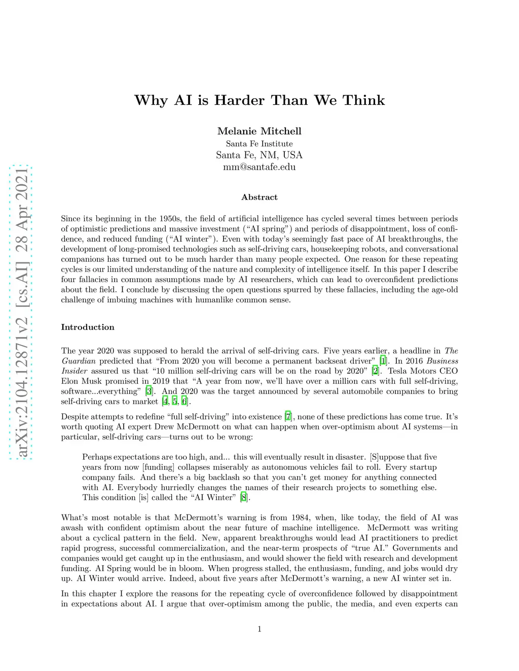 Since its beginning in the 1950s, the field of artificial intelligence has cycled several times between periods of optimistic predictions and massive investment ("AI spring") and periods of disappointment, loss of confidence, and reduced funding ("AI winter"). Even with today's seemingly fast pace of AI breakthroughs, the development of long-promised technologies such as self-driving cars, housekeeping robots, and conversational companions has turned out to be much harder than many people expected. One reason for these repeating cycles is our limited understanding of the nature and complexity of intelligence itself. In this paper I describe four fallacies in common assumptions made by AI researchers, which can lead to overconfident predictions about the field. I conclude by discussing the open questions spurred by these fallacies, including the age-old challenge of imbuing machines with humanlike common sense.