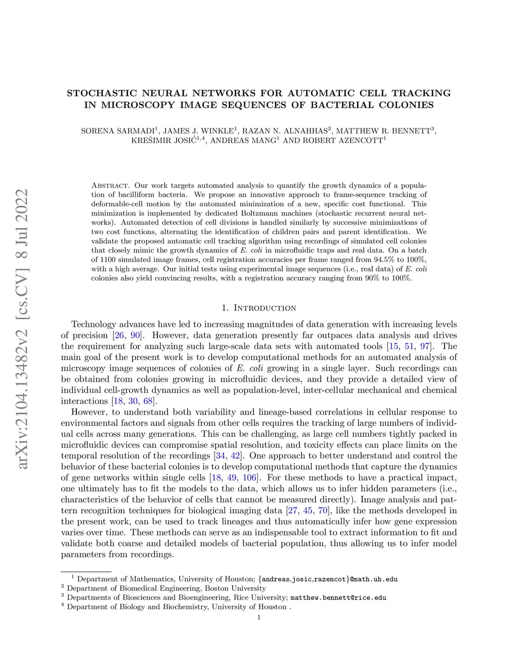 Our work targets automated analysis to quantify the growth dynamics of a population of bacilliform bacteria. We propose an innovative approach to frame-sequence tracking of deformable-cell motion by the automated minimization of a new, specific cost functional. This minimization is implemented by dedicated Boltzmann machines (stochastic recurrent neural networks). Automated detection of cell divisions is handled similarly by successive minimizations of two cost functions, alternating the identification of children pairs and parent identification. We validate the proposed automatic cell tracking algorithm using (i) recordings of simulated cell colonies that closely mimic the growth dynamics of E. coli in microfluidic traps and (ii) real data. On a batch of 1100 simulated image frames, cell registration accuracies per frame ranged from 94.5% to 100%, with a high average. Our initial tests using experimental image sequences (i.e., real data) of E. coli colonies also yield convincing results, with a registration accuracy ranging from 90% to 100%.