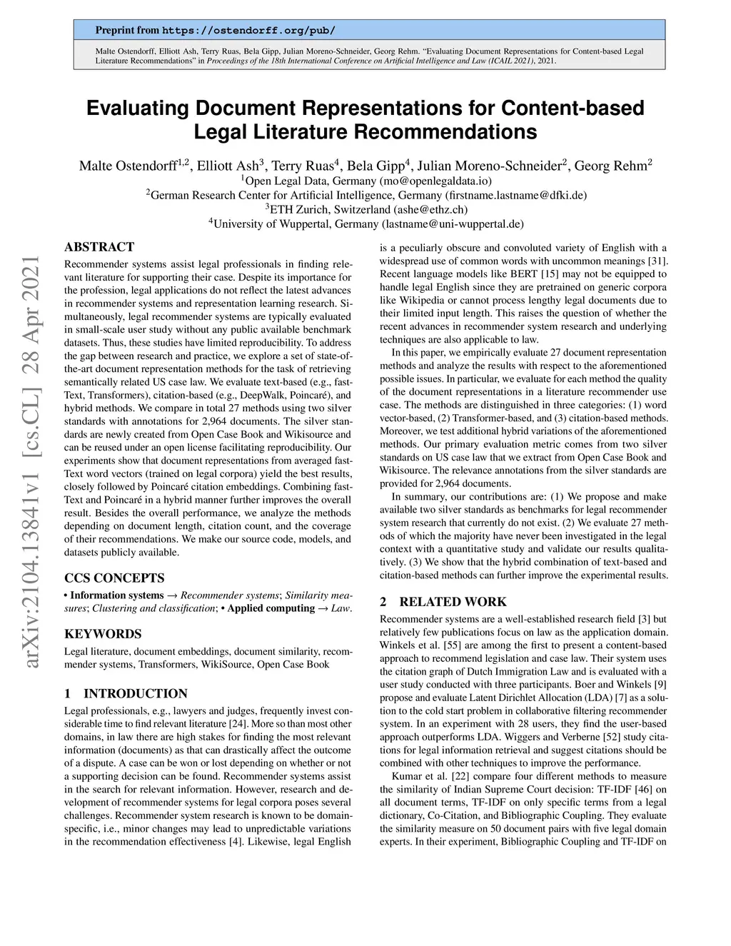 Recommender systems assist legal professionals in finding relevant literature for supporting their case. Despite its importance for the profession, legal applications do not reflect the latest advances in recommender systems and representation learning research. Simultaneously, legal recommender systems are typically evaluated in small-scale user study without any public available benchmark datasets. Thus, these studies have limited reproducibility. To address the gap between research and practice, we explore a set of state-of-the-art document representation methods for the task of retrieving semantically related US case law. We evaluate text-based (e.g., fastText, Transformers), citation-based (e.g., DeepWalk, Poincar\é), and hybrid methods. We compare in total 27 methods using two silver standards with annotations for 2,964 documents. The silver standards are newly created from Open Case Book and Wikisource and can be reused under an open license facilitating reproducibility. Our experiments show that document representations from averaged fastText word vectors (trained on legal corpora) yield the best results, closely followed by Poincar\é citation embeddings. Combining fastText and Poincar\é in a hybrid manner further improves the overall result. Besides the overall performance, we analyze the methods depending on document length, citation count, and the coverage of their recommendations. We make our source code, models, and datasets publicly available at https://github.com/malteos/legal-document-similarity/.