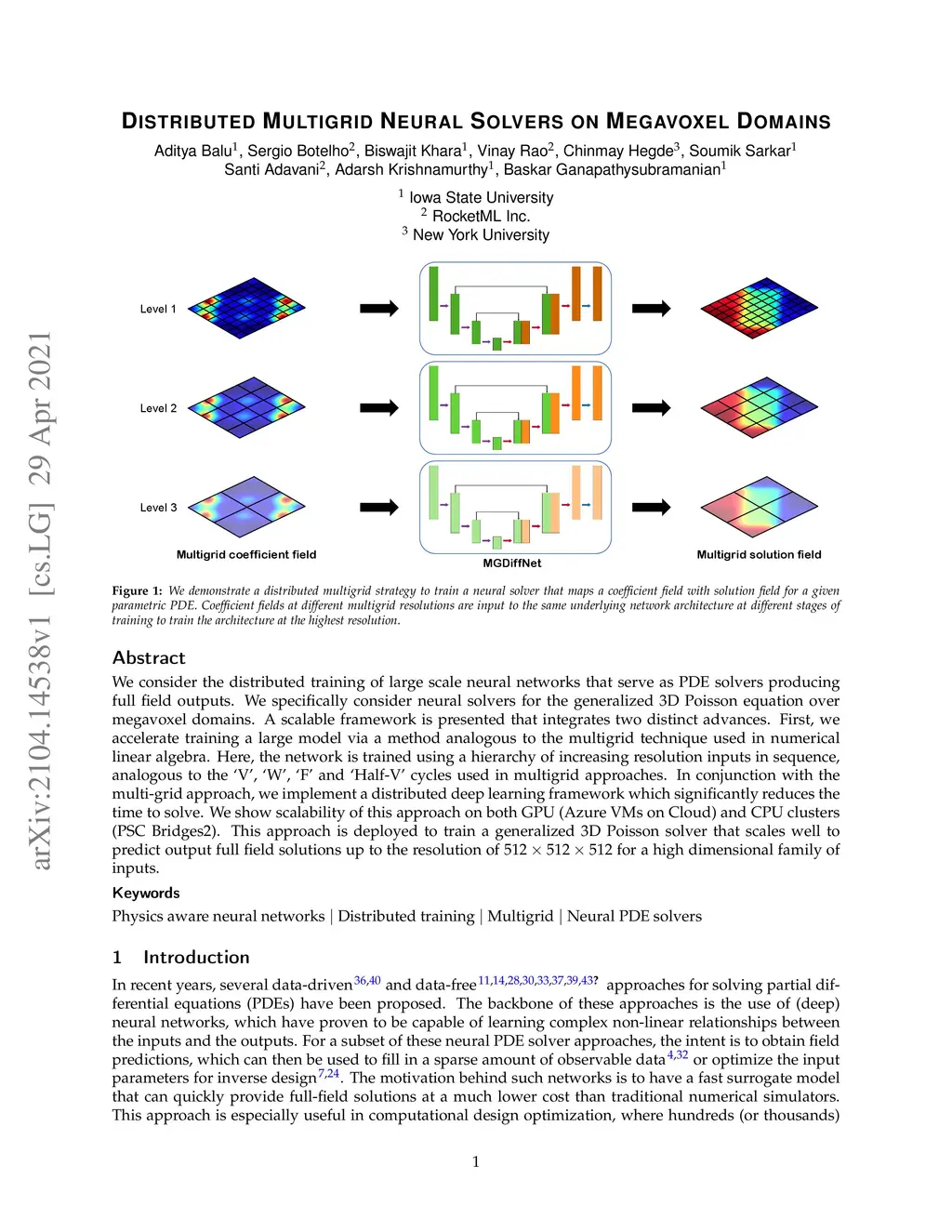 We consider the distributed training of large-scale neural networks that serve as PDE solvers producing full field outputs. We specifically consider neural solvers for the generalized 3D Poisson equation over megavoxel domains. A scalable framework is presented that integrates two distinct advances. First, we accelerate training a large model via a method analogous to the multigrid technique used in numerical linear algebra. Here, the network is trained using a hierarchy of increasing resolution inputs in sequence, analogous to the 'V', 'W', 'F', and 'Half-V' cycles used in multigrid approaches. In conjunction with the multi-grid approach, we implement a distributed deep learning framework which significantly reduces the time to solve. We show the scalability of this approach on both GPU (Azure VMs on Cloud) and CPU clusters (PSC Bridges2). This approach is deployed to train a generalized 3D Poisson solver that scales well to predict output full-field solutions up to the resolution of 512x512x512 for a high dimensional family of inputs.
