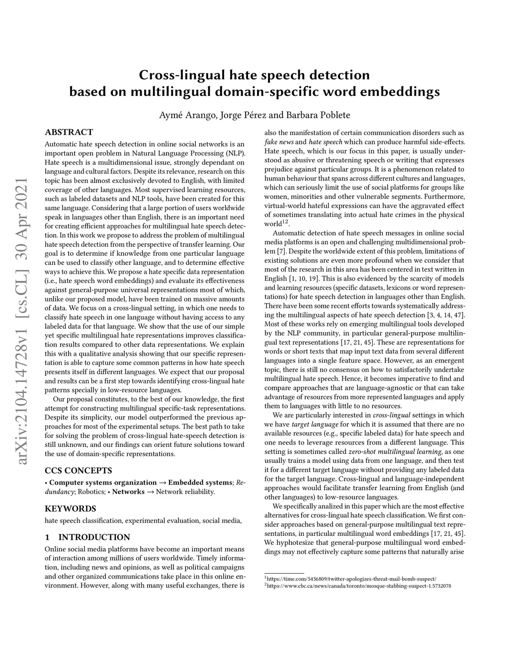 Automatic hate speech detection in online social networks is an important open problem in Natural Language Processing (NLP). Hate speech is a multidimensional issue, strongly dependant on language and cultural factors. Despite its relevance, research on this topic has been almost exclusively devoted to English. Most supervised learning resources, such as labeled datasets and NLP tools, have been created for this same language. Considering that a large portion of users worldwide speak in languages other than English, there is an important need for creating efficient approaches for multilingual hate speech detection. In this work we propose to address the problem of multilingual hate speech detection from the perspective of transfer learning. Our goal is to determine if knowledge from one particular language can be used to classify other language, and to determine effective ways to achieve this. We propose a hate specific data representation and evaluate its effectiveness against general-purpose universal representations most of which, unlike our proposed model, have been trained on massive amounts of data. We focus on a cross-lingual setting, in which one needs to classify hate speech in one language without having access to any labeled data for that language. We show that the use of our simple yet specific multilingual hate representations improves classification results. We explain this with a qualitative analysis showing that our specific representation is able to capture some common patterns in how hate speech presents itself in different languages. Our proposal constitutes, to the best of our knowledge, the first attempt for constructing multilingual specific-task representations. Despite its simplicity, our model outperformed the previous approaches for most of the experimental setups. Our findings can orient future solutions toward the use of domain-specific representations.