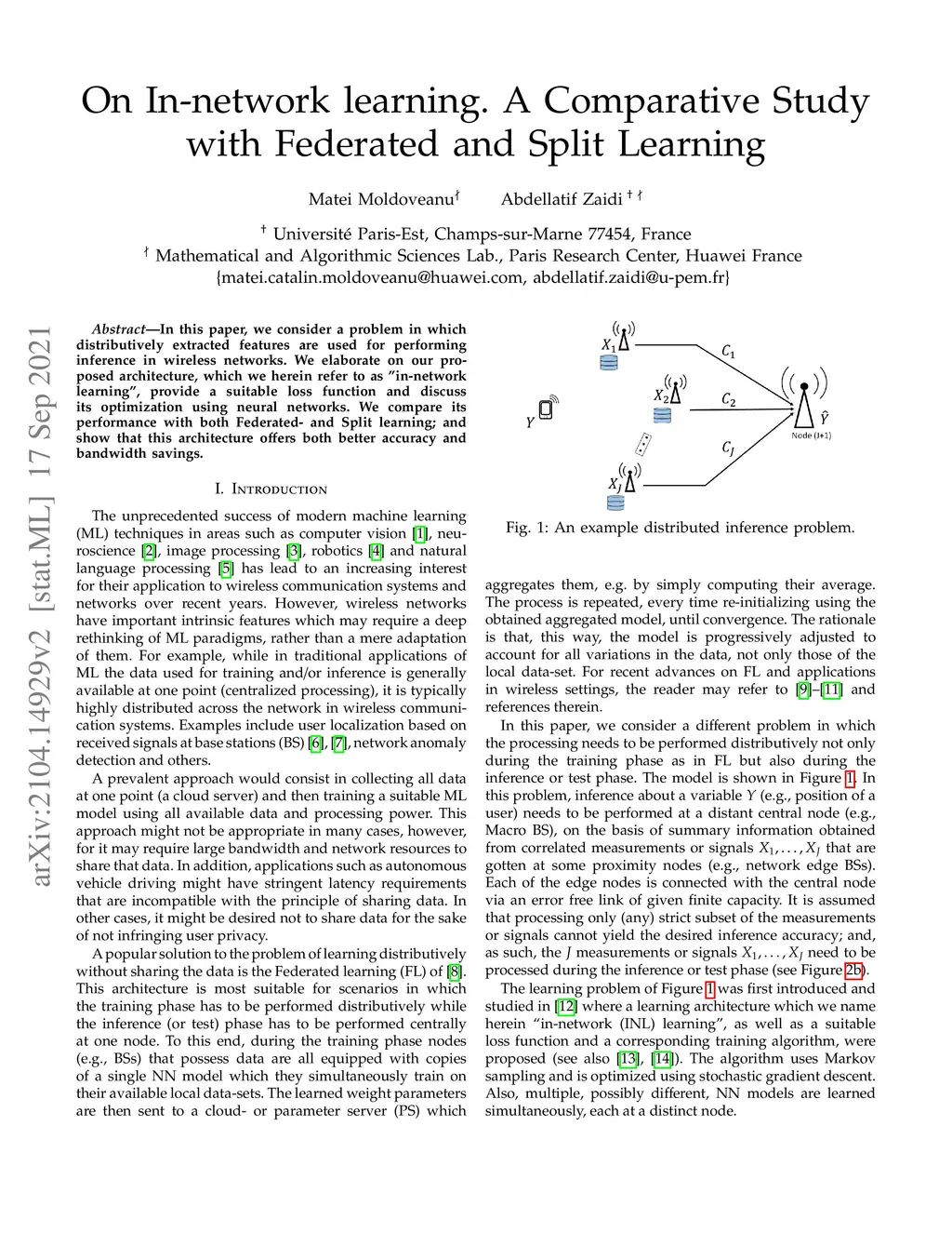 In this paper, we consider a problem in which distributively extracted features are used for performing inference in wireless networks. We elaborate on our proposed architecture, which we herein refer to as "in-network learning", provide a suitable loss function and discuss its optimization using neural networks. We compare its performance with both Federated- and Split learning; and show that this architecture offers both better accuracy and bandwidth savings.