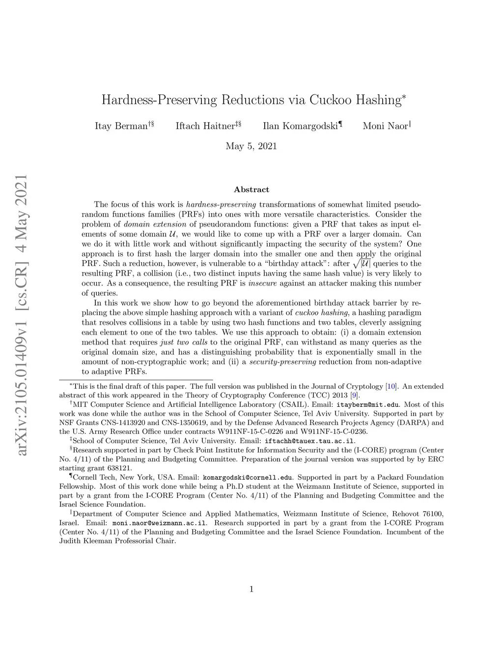 The focus of this work is \emph{hardness-preserving} transformations of somewhat limited pseudorandom functions families (PRFs) into ones with more versatile characteristics. Consider the problem of \emph{domain extension} of pseudorandom functions: given a PRF that takes as input elements of some domain , we would like to come up with a PRF over a larger domain. Can we do it with little work and without significantly impacting the security of the system? One approach is to first hash the larger domain into the smaller one and then apply the original PRF. Such a reduction, however, is vulnerable to a "birthday attack": after queries to the resulting PRF, a collision (\ie two distinct inputs having the same hash value) is very likely to occur. As a consequence, the resulting PRF is \emph{insecure} against an attacker making this number of queries. In this work we show how to go beyond the aforementioned birthday attack barrier by replacing the above simple hashing approach with a variant of \textit{cuckoo hashing}, a hashing paradigm that resolves collisions in a table by using two hash functions and two tables, cleverly assigning each element to one of the two tables. We use this approach to obtain: (i) a domain extension method that requires {\em just two calls} to the original PRF, can withstand as many queries as the original domain size, and has a distinguishing probability that is exponentially small in the amount of non-cryptographic work; and (ii) a {\em security-preserving} reduction from non-adaptive to adaptive PRFs.