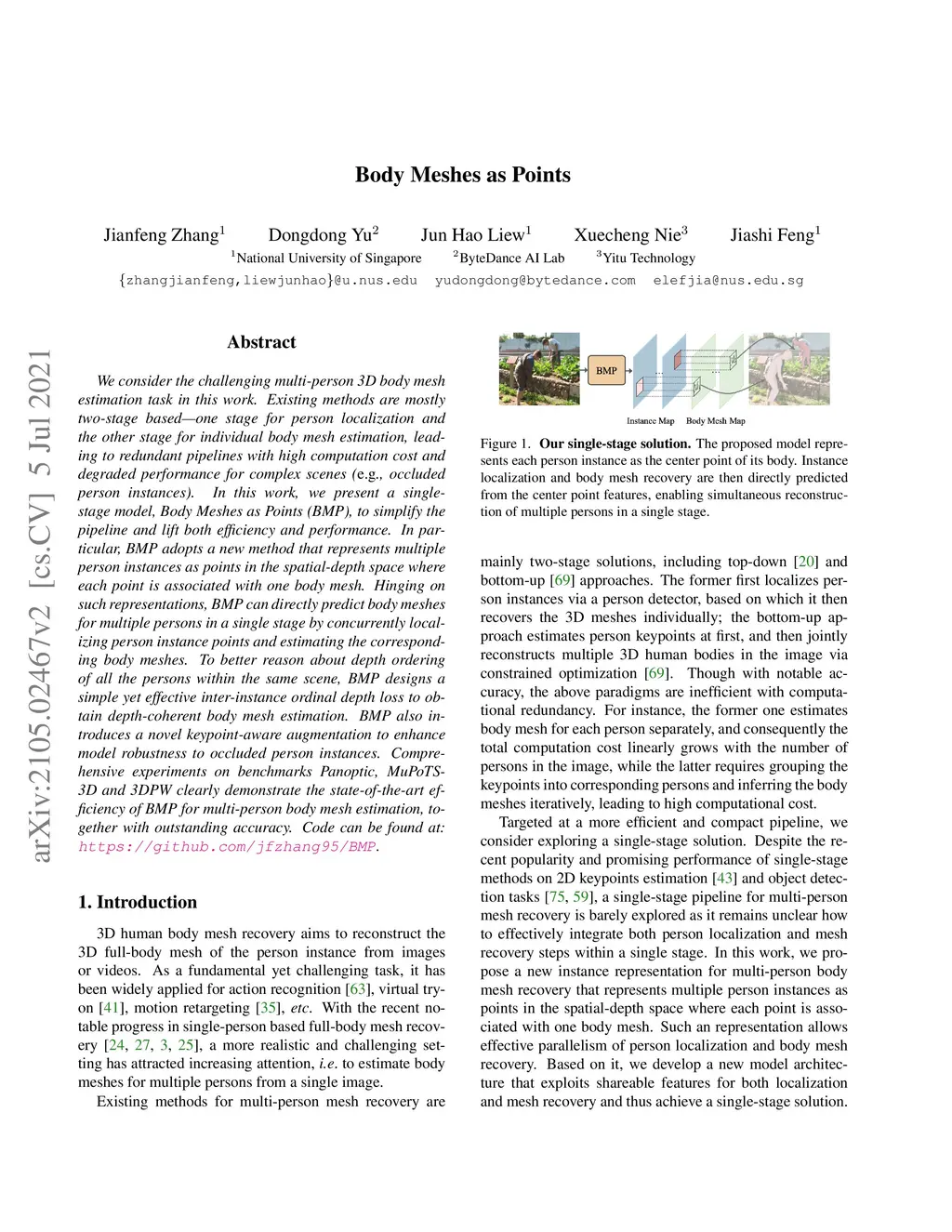 We consider the challenging multi-person 3D body mesh estimation task in this work. Existing methods are mostly two-stage based--one stage for person localization and the other stage for individual body mesh estimation, leading to redundant pipelines with high computation cost and degraded performance for complex scenes (e.g., occluded person instances). In this work, we present a single-stage model, Body Meshes as Points (BMP), to simplify the pipeline and lift both efficiency and performance. In particular, BMP adopts a new method that represents multiple person instances as points in the spatial-depth space where each point is associated with one body mesh. Hinging on such representations, BMP can directly predict body meshes for multiple persons in a single stage by concurrently localizing person instance points and estimating the corresponding body meshes. To better reason about depth ordering of all the persons within the same scene, BMP designs a simple yet effective inter-instance ordinal depth loss to obtain depth-coherent body mesh estimation. BMP also introduces a novel keypoint-aware augmentation to enhance model robustness to occluded person instances. Comprehensive experiments on benchmarks Panoptic, MuPoTS-3D and 3DPW clearly demonstrate the state-of-the-art efficiency of BMP for multi-person body mesh estimation, together with outstanding accuracy. Code can be found at: https://github.com/jfzhang95/BMP.