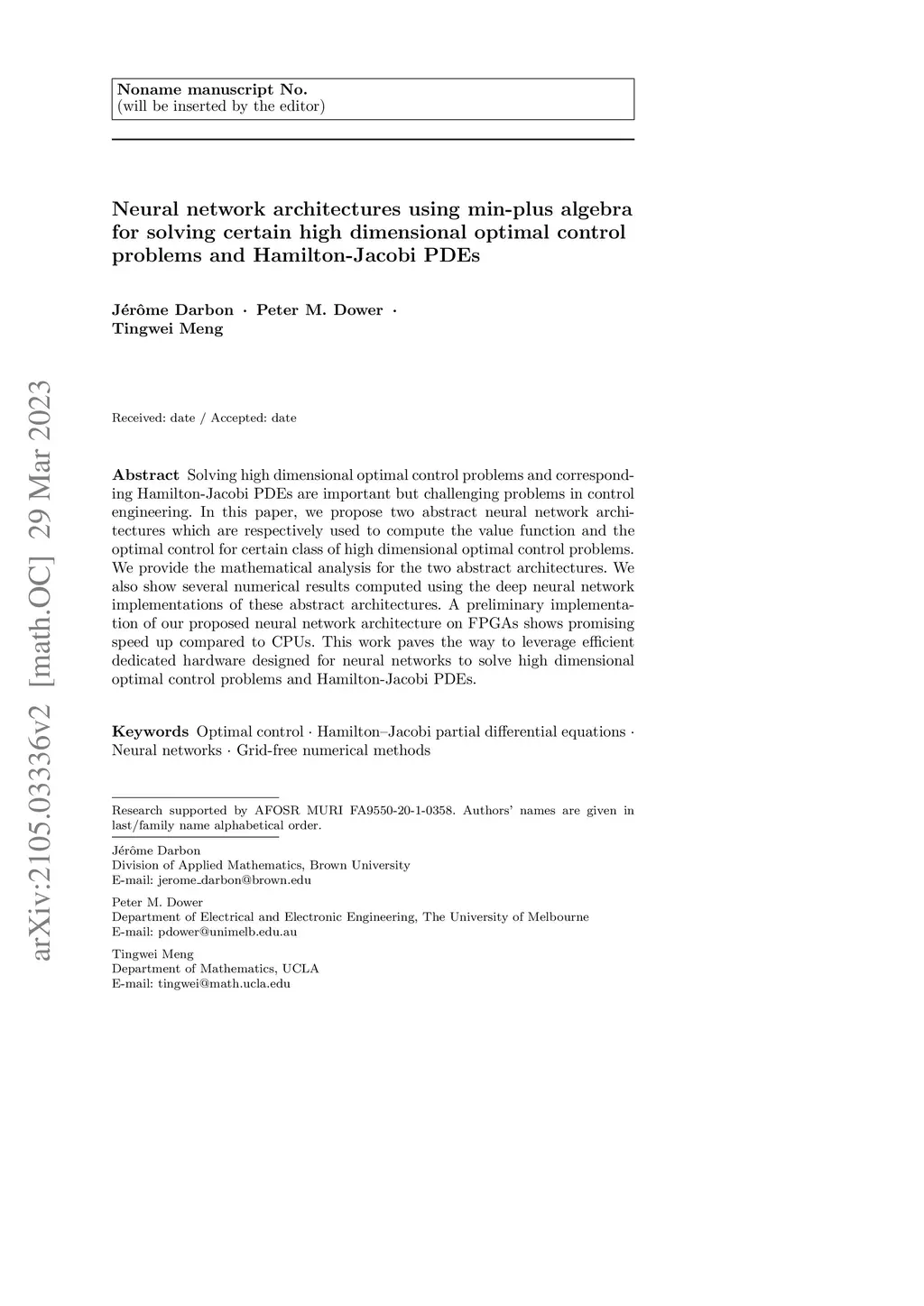 Solving high dimensional optimal control problems and corresponding Hamilton-Jacobi PDEs are important but challenging problems in control engineering. In this paper, we propose two abstract neural network architectures which are respectively used to compute the value function and the optimal control for certain class of high dimensional optimal control problems. We provide the mathematical analysis for the two abstract architectures. We also show several numerical results computed using the deep neural network implementations of these abstract architectures. A preliminary implementation of our proposed neural network architecture on FPGAs shows promising speed up compared to CPUs. This work paves the way to leverage efficient dedicated hardware designed for neural networks to solve high dimensional optimal control problems and Hamilton-Jacobi PDEs.