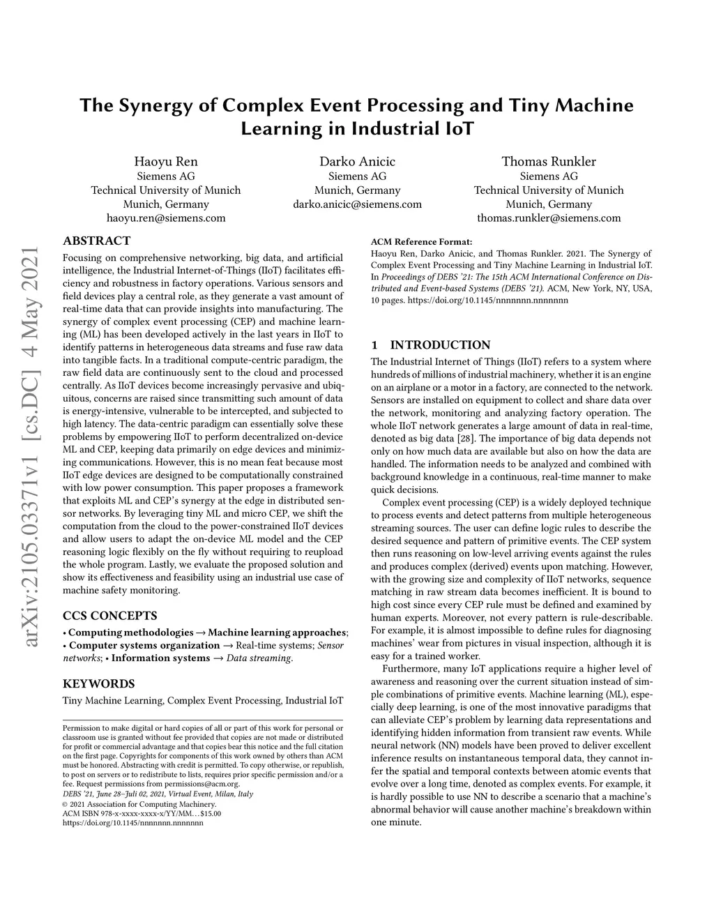 Focusing on comprehensive networking, big data, and artificial intelligence, the Industrial Internet-of-Things (IIoT) facilitates efficiency and robustness in factory operations. Various sensors and field devices play a central role, as they generate a vast amount of real-time data that can provide insights into manufacturing. The synergy of complex event processing (CEP) and machine learning (ML) has been developed actively in the last years in IIoT to identify patterns in heterogeneous data streams and fuse raw data into tangible facts. In a traditional compute-centric paradigm, the raw field data are continuously sent to the cloud and processed centrally. As IIoT devices become increasingly pervasive and ubiquitous, concerns are raised since transmitting such amount of data is energy-intensive, vulnerable to be intercepted, and subjected to high latency. The data-centric paradigm can essentially solve these problems by empowering IIoT to perform decentralized on-device ML and CEP, keeping data primarily on edge devices and minimizing communications. However, this is no mean feat because most IIoT edge devices are designed to be computationally constrained with low power consumption. This paper proposes a framework that exploits ML and CEP's synergy at the edge in distributed sensor networks. By leveraging tiny ML and micro CEP, we shift the computation from the cloud to the power-constrained IIoT devices and allow users to adapt the on-device ML model and the CEP reasoning logic flexibly on the fly without requiring to reupload the whole program. Lastly, we evaluate the proposed solution and show its effectiveness and feasibility using an industrial use case of machine safety monitoring.