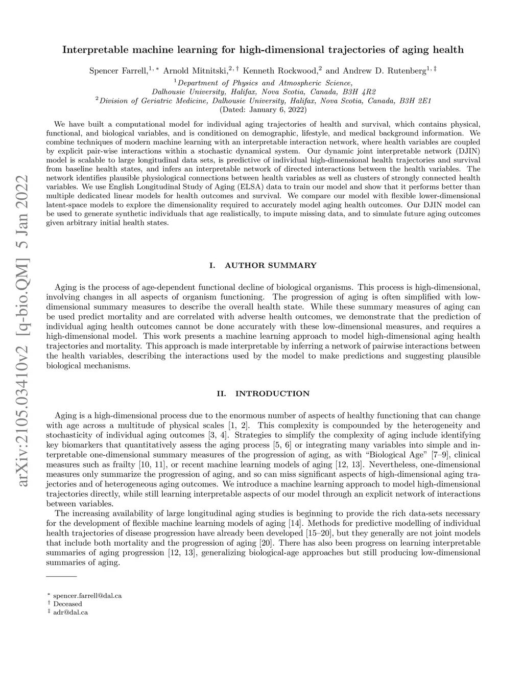 We have built a computational model for individual aging trajectories of health and survival, which contains physical, functional, and biological variables, and is conditioned on demographic, lifestyle, and medical background information. We combine techniques of modern machine learning with an interpretable interaction network, where health variables are coupled by explicit pair-wise interactions within a stochastic dynamical system. Our dynamic joint interpretable network (DJIN) model is scalable to large longitudinal data sets, is predictive of individual high-dimensional health trajectories and survival from baseline health states, and infers an interpretable network of directed interactions between the health variables. The network identifies plausible physiological connections between health variables as well as clusters of strongly connected health variables. We use English Longitudinal Study of Aging (ELSA) data to train our model and show that it performs better than multiple dedicated linear models for health outcomes and survival. We compare our model with flexible lower-dimensional latent-space models to explore the dimensionality required to accurately model aging health outcomes. Our DJIN model can be used to generate synthetic individuals that age realistically, to impute missing data, and to simulate future aging outcomes given arbitrary initial health states.