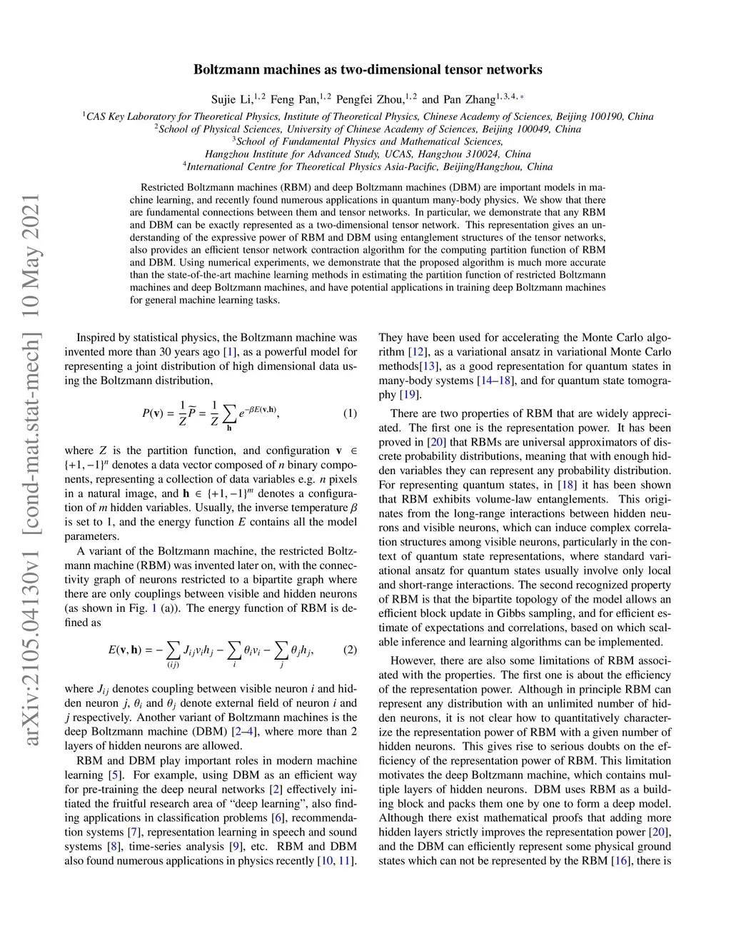 Boltzmann machines as two-dimensional tensor networks