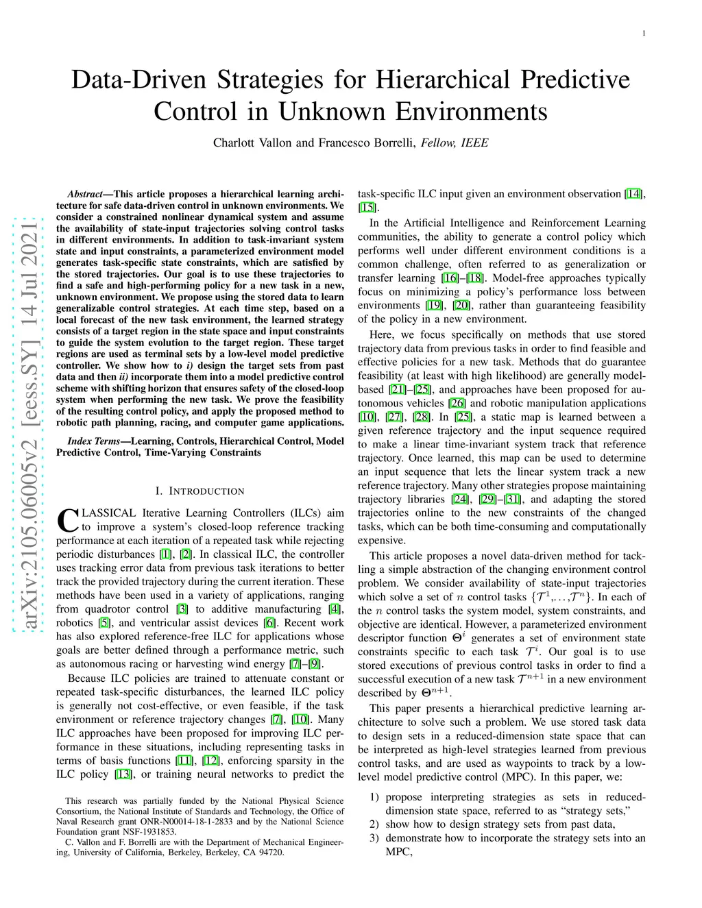 This article proposes a hierarchical learning architecture for safe data-driven control in unknown environments. We consider a constrained nonlinear dynamical system and assume the availability of state-input trajectories solving control tasks in different environments. In addition to task-invariant system state and input constraints, a parameterized environment model generates task-specific state constraints, which are satisfied by the stored trajectories. Our goal is to use these trajectories to find a safe and high-performing policy for a new task in a new, unknown environment. We propose using the stored data to learn generalizable control strategies. At each time step, based on a local forecast of the new task environment, the learned strategy consists of a target region in the state space and input constraints to guide the system evolution to the target region. These target regions are used as terminal sets by a low-level model predictive controller. We show how to i) design the target sets from past data and then ii) incorporate them into a model predictive control scheme with shifting horizon that ensures safety of the closed-loop system when performing the new task. We prove the feasibility of the resulting control policy, and apply the proposed method to robotic path planning, racing, and computer game applications.