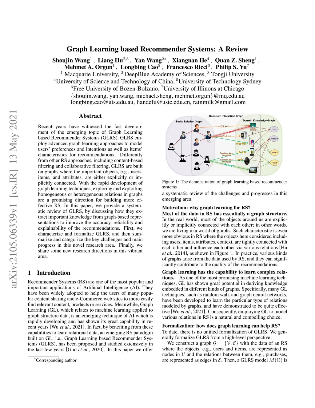 Recent years have witnessed the fast development of the emerging topic of Graph Learning based Recommender Systems (GLRS). GLRS employ advanced graph learning approaches to model users' preferences and intentions as well as items' characteristics for recommendations. Differently from other RS approaches, including content-based filtering and collaborative filtering, GLRS are built on graphs where the important objects, e.g., users, items, and attributes, are either explicitly or implicitly connected. With the rapid development of graph learning techniques, exploring and exploiting homogeneous or heterogeneous relations in graphs are a promising direction for building more effective RS. In this paper, we provide a systematic review of GLRS, by discussing how they extract important knowledge from graph-based representations to improve the accuracy, reliability and explainability of the recommendations. First, we characterize and formalize GLRS, and then summarize and categorize the key challenges and main progress in this novel research area. Finally, we share some new research directions in this vibrant area.