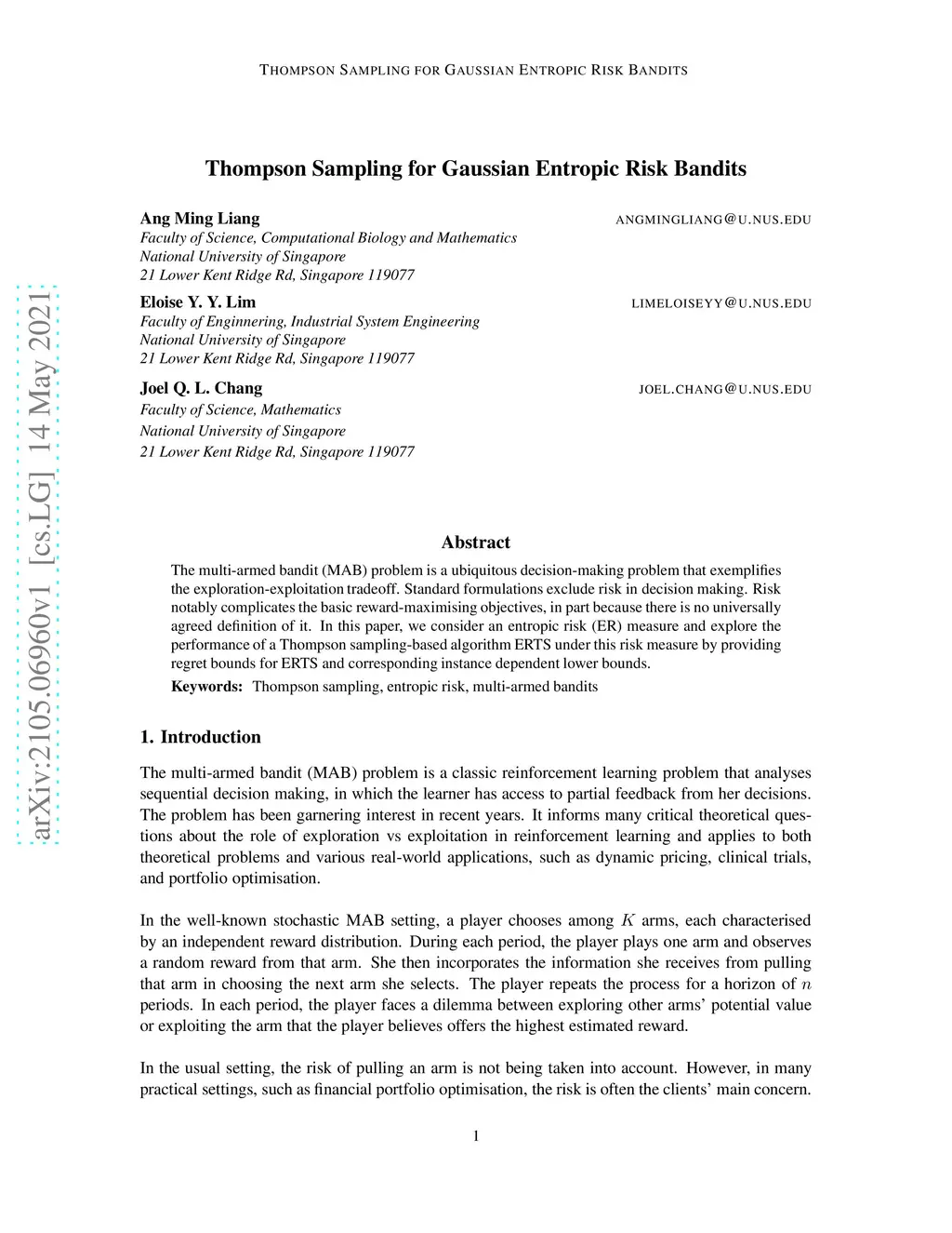 The multi-armed bandit (MAB) problem is a ubiquitous decision-making problem that exemplifies exploration-exploitation tradeoff. Standard formulations exclude risk in decision making. Risknotably complicates the basic reward-maximising objectives, in part because there is no universally agreed definition of it. In this paper, we consider an entropic risk (ER) measure and explore the performance of a Thompson sampling-based algorithm ERTS under this risk measure by providing regret bounds for ERTS and corresponding instance dependent lower bounds.