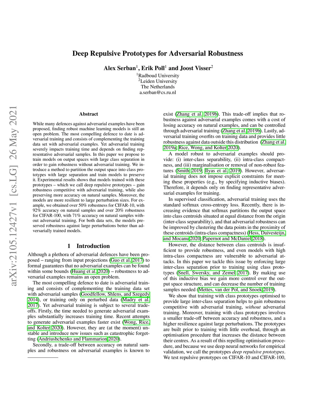While many defences against adversarial examples have been proposed, finding robust machine learning models is still an open problem. The most compelling defence to date is adversarial training and consists of complementing the training data set with adversarial examples. Yet adversarial training severely impacts training time and depends on finding representative adversarial samples. In this paper we propose to train models on output spaces with large class separation in order to gain robustness without adversarial training. We introduce a method to partition the output space into class prototypes with large separation and train models to preserve it. Experimental results shows that models trained with these prototypes -- which we call deep repulsive prototypes -- gain robustness competitive with adversarial training, while also preserving more accuracy on natural samples. Moreover, the models are more resilient to large perturbation sizes. For example, we obtained over 50% robustness for CIFAR-10, with 92% accuracy on natural samples and over 20% robustness for CIFAR-100, with 71% accuracy on natural samples without adversarial training. For both data sets, the models preserved robustness against large perturbations better than adversarially trained models.