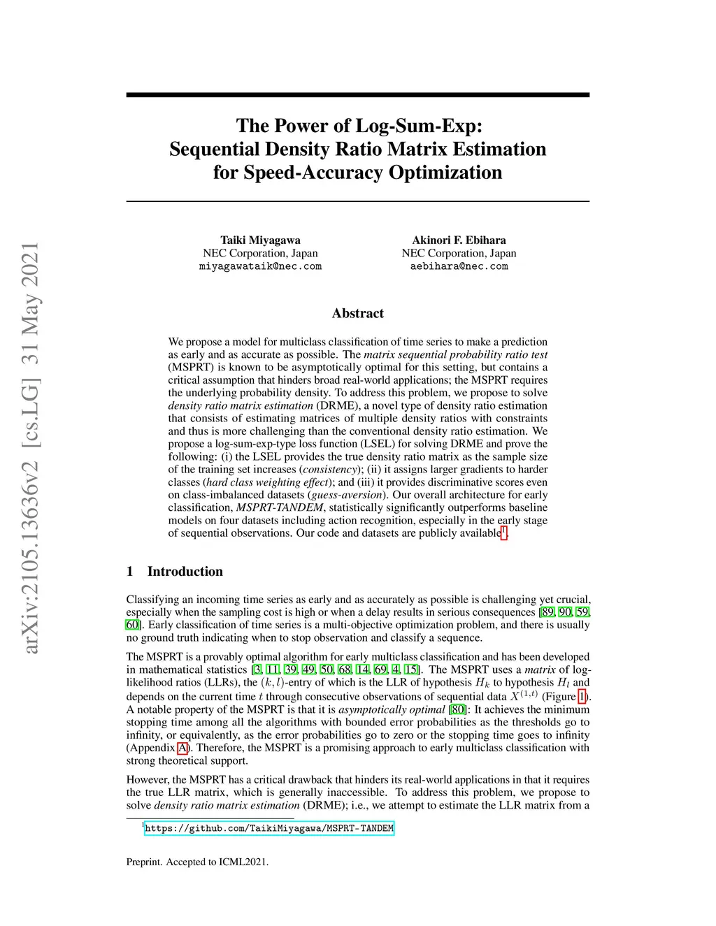 We propose a model for multiclass classification of time series to make a prediction as early and as accurate as possible. The matrix sequential probability ratio test (MSPRT) is known to be asymptotically optimal for this setting, but contains a critical assumption that hinders broad real-world applications; the MSPRT requires the underlying probability density. To address this problem, we propose to solve density ratio matrix estimation (DRME), a novel type of density ratio estimation that consists of estimating matrices of multiple density ratios with constraints and thus is more challenging than the conventional density ratio estimation. We propose a log-sum-exp-type loss function (LSEL) for solving DRME and prove the following: (i) the LSEL provides the true density ratio matrix as the sample size of the training set increases (consistency); (ii) it assigns larger gradients to harder classes (hard class weighting effect); and (iii) it provides discriminative scores even on class-imbalanced datasets (guess-aversion). Our overall architecture for early classification, MSPRT-TANDEM, statistically significantly outperforms baseline models on four datasets including action recognition, especially in the early stage of sequential observations. Our code and datasets are publicly available at: https://github.com/TaikiMiyagawa/MSPRT-TANDEM.