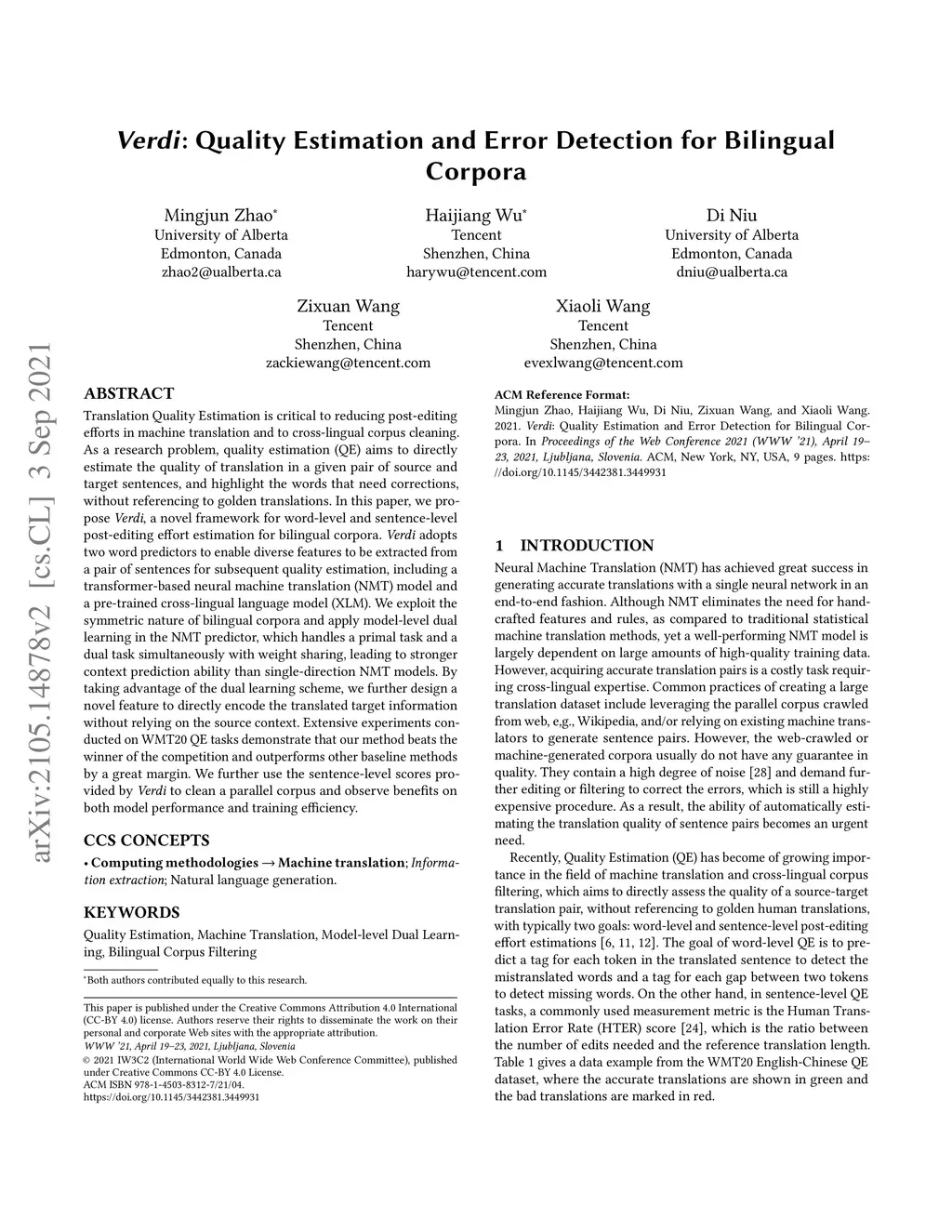 Verdi: Quality Estimation and Error Detection for Bilingual Corpora