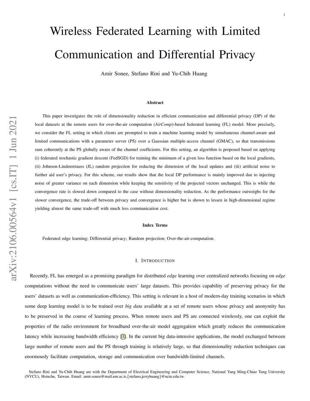 This paper investigates the role of dimensionality reduction in efficient communication and differential privacy (DP) of the local datasets at the remote users for over-the-air computation (AirComp)-based federated learning (FL) model. More precisely, we consider the FL setting in which clients are prompted to train a machine learning model by simultaneous channel-aware and limited communications with a parameter server (PS) over a Gaussian multiple-access channel (GMAC), so that transmissions sum coherently at the PS globally aware of the channel coefficients. For this setting, an algorithm is proposed based on applying federated stochastic gradient descent (FedSGD) for training the minimum of a given loss function based on the local gradients, Johnson-Lindenstrauss (JL) random projection for reducing the dimension of the local updates, and artificial noise to further aid user's privacy. For this scheme, our results show that the local DP performance is mainly improved due to injecting noise of greater variance on each dimension while keeping the sensitivity of the projected vectors unchanged. This is while the convergence rate is slowed down compared to the case without dimensionality reduction. As the performance outweighs for the slower convergence, the trade-off between privacy and convergence is higher but is shown to lessen in high-dimensional regime yielding almost the same trade-off with much less communication cost.