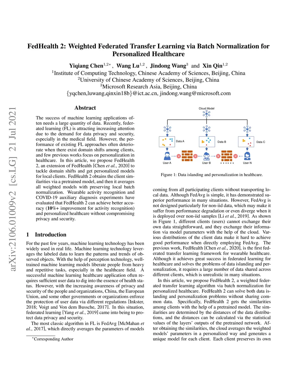 The success of machine learning applications often needs a large quantity of data. Recently, federated learning (FL) is attracting increasing attention due to the demand for data privacy and security, especially in the medical field. However, the performance of existing FL approaches often deteriorates when there exist domain shifts among clients, and few previous works focus on personalization in healthcare. In this article, we propose FedHealth 2, an extension of FedHealth \cite{chen2020fedhealth} to tackle domain shifts and get personalized models for local clients. FedHealth 2 obtains the client similarities via a pretrained model, and then it averages all weighted models with preserving local batch normalization. Wearable activity recognition and COVID-19 auxiliary diagnosis experiments have evaluated that FedHealth 2 can achieve better accuracy (10%+ improvement for activity recognition) and personalized healthcare without compromising privacy and security.