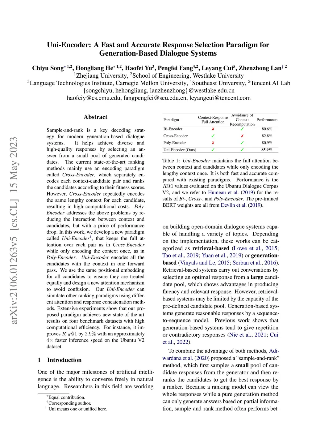 Sample-and-rank is a key decoding strategy for modern generation-based dialogue systems. It helps achieve diverse and high-quality responses by selecting an answer from a small pool of generated candidates. The current state-of-the-art ranking methods mainly use an encoding paradigm called Cross-Encoder, which separately encodes each context-candidate pair and ranks the candidates according to their fitness scores. However, Cross-Encoder repeatedly encodes the same lengthy context for each candidate, resulting in high computational costs. Poly-Encoder addresses the above problems by reducing the interaction between context and candidates, but with a price of performance drop. In this work, we develop a new paradigm called Uni-Encoder, that keeps the full attention over each pair as in Cross-Encoder while only encoding the context once, as in Poly-Encoder. Uni-Encoder encodes all the candidates with the context in one forward pass. We use the same positional embedding for all candidates to ensure they are treated equally and design a new attention mechanism to avoid confusion. Our Uni-Encoder can simulate other ranking paradigms using different attention and response concatenation methods. Extensive experiments show that our proposed paradigm achieves new state-of-the-art results on four benchmark datasets with high computational efficiency. For instance, it improves R10@1 by 2.9% with an approximately 4X faster inference speed on the Ubuntu V2 dataset.