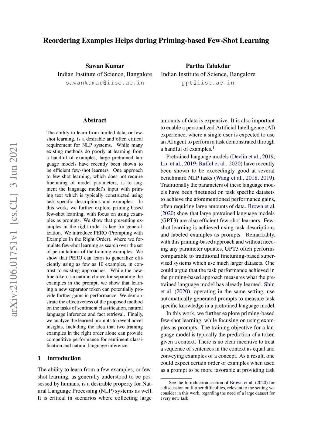 Reordering Examples Helps during Priming-based Few-Shot Learning