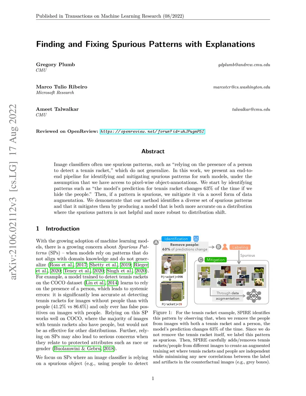 Image classifiers often use spurious patterns, such as "relying on the presence of a person to detect a tennis racket, which do not generalize. In this work, we present an end-to-end pipeline for identifying and mitigating spurious patterns for such models, under the assumption that we have access to pixel-wise object-annotations. We start by identifying patterns such as "the model's prediction for tennis racket changes 63% of the time if we hide the people." Then, if a pattern is spurious, we mitigate it via a novel form of data augmentation. We demonstrate that our method identifies a diverse set of spurious patterns and that it mitigates them by producing a model that is both more accurate on a distribution where the spurious pattern is not helpful and more robust to distribution shift.