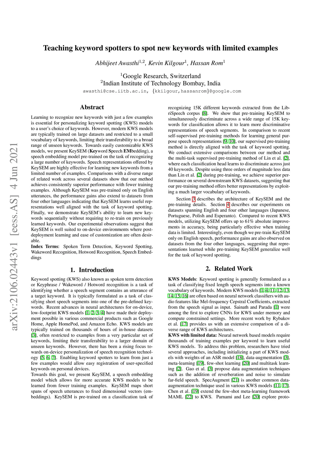 Learning to recognize new keywords with just a few examples is essential for personalizing keyword spotting (KWS) models to a user's choice of keywords. However, modern KWS models are typically trained on large datasets and restricted to a small vocabulary of keywords, limiting their transferability to a broad range of unseen keywords. Towards easily customizable KWS models, we present KeySEM (Keyword Speech EMbedding), a speech embedding model pre-trained on the task of recognizing a large number of keywords. Speech representations offered by KeySEM are highly effective for learning new keywords from a limited number of examples. Comparisons with a diverse range of related work across several datasets show that our method achieves consistently superior performance with fewer training examples. Although KeySEM was pre-trained only on English utterances, the performance gains also extend to datasets from four other languages indicating that KeySEM learns useful representations well aligned with the task of keyword spotting. Finally, we demonstrate KeySEM's ability to learn new keywords sequentially without requiring to re-train on previously learned keywords. Our experimental observations suggest that KeySEM is well suited to on-device environments where post-deployment learning and ease of customization are often desirable.