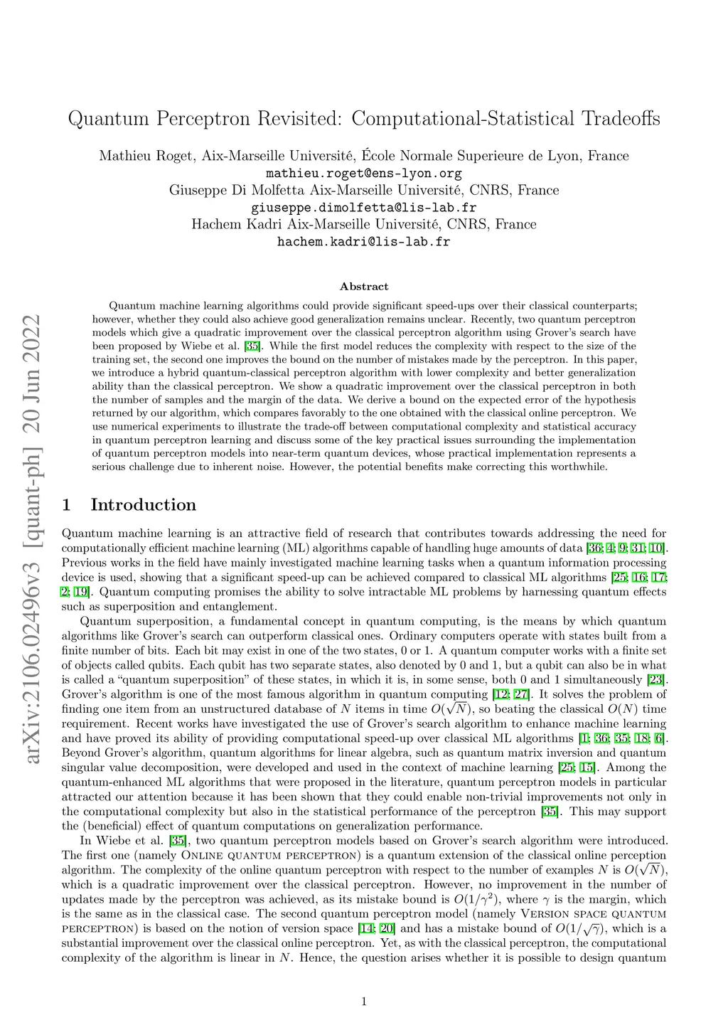 Quantum machine learning algorithms could provide significant speed-ups over their classical counterparts; however, whether they could also achieve good generalization remains unclear. Recently, two quantum perceptron models which give a quadratic improvement over the classical perceptron algorithm using Grover's search have been proposed by Wiebe et al. arXiv:1602.04799 . While the first model reduces the complexity with respect to the size of the training set, the second one improves the bound on the number of mistakes made by the perceptron. In this paper, we introduce a hybrid quantum-classical perceptron algorithm with lower complexity and better generalization ability than the classical perceptron. We show a quadratic improvement over the classical perceptron in both the number of samples and the margin of the data. We derive a bound on the expected error of the hypothesis returned by our algorithm, which compares favorably to the one obtained with the classical online perceptron. We use numerical experiments to illustrate the trade-off between computational complexity and statistical accuracy in quantum perceptron learning and discuss some of the key practical issues surrounding the implementation of quantum perceptron models into near-term quantum devices, whose practical implementation represents a serious challenge due to inherent noise. However, the potential benefits make correcting this worthwhile.
