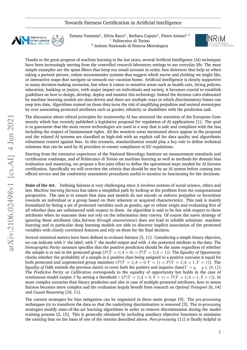 Thanks to the great progress of machine learning in the last years, several Artificial Intelligence (AI) techniques have been increasingly moving from the controlled research laboratory settings to our everyday life. AI is clearly supportive in many decision-making scenarios, but when it comes to sensitive areas such as health care, hiring policies, education, banking or justice, with major impact on individuals and society, it becomes crucial to establish guidelines on how to design, develop, deploy and monitor this technology. Indeed the decision rules elaborated by machine learning models are data-driven and there are multiple ways in which discriminatory biases can seep into data. Algorithms trained on those data incur the risk of amplifying prejudices and societal stereotypes by over associating protected attributes such as gender, ethnicity or disabilities with the prediction task. Starting from the extensive experience of the National Metrology Institute on measurement standards and certification roadmaps, and of Politecnico di Torino on machine learning as well as methods for domain bias evaluation and mastering, we propose a first joint effort to define the operational steps needed for AI fairness certification. Specifically we will overview the criteria that should be met by an AI system before coming into official service and the conformity assessment procedures useful to monitor its functioning for fair decisions.