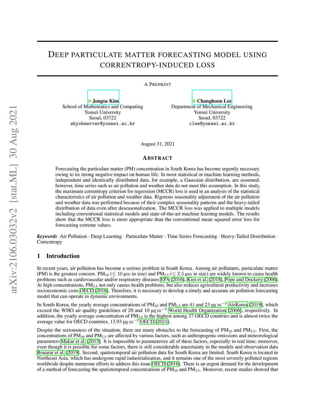 Forecasting the particulate matter (PM) concentration in South Korea has become urgently necessary owing to its strong negative impact on human life. In most statistical or machine learning methods, independent and identically distributed data, for example, a Gaussian distribution, are assumed; however, time series such as air pollution and weather data do not meet this assumption. In this study, the maximum correntropy criterion for regression (MCCR) loss is used in an analysis of the statistical characteristics of air pollution and weather data. Rigorous seasonality adjustment of the air pollution and weather data was performed because of their complex seasonality patterns and the heavy-tailed distribution of data even after deseasonalization. The MCCR loss was applied to multiple models including conventional statistical models and state-of-the-art machine learning models. The results show that the MCCR loss is more appropriate than the conventional mean squared error loss for forecasting extreme values.