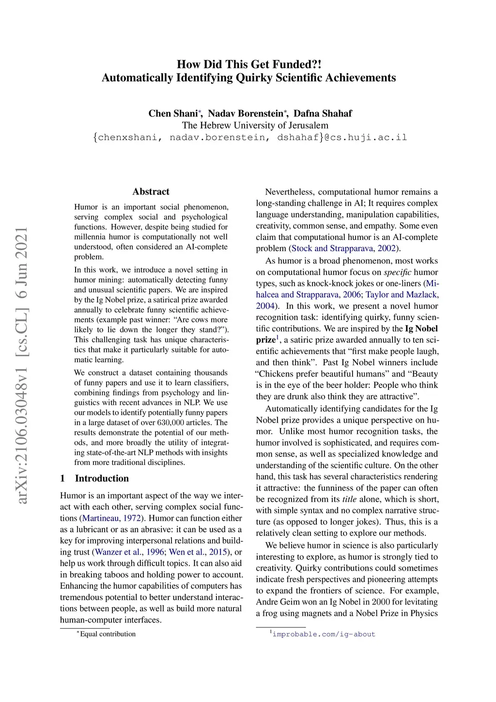 Humor is an important social phenomenon, serving complex social and psychological functions. However, despite being studied for millennia humor is computationally not well understood, often considered an AI-complete problem. In this work, we introduce a novel setting in humor mining: automatically detecting funny and unusual scientific papers. We are inspired by the Ig Nobel prize, a satirical prize awarded annually to celebrate funny scientific achievements (example past winner: "Are cows more likely to lie down the longer they stand?"). This challenging task has unique characteristics that make it particularly suitable for automatic learning. We construct a dataset containing thousands of funny papers and use it to learn classifiers, combining findings from psychology and linguistics with recent advances in NLP. We use our models to identify potentially funny papers in a large dataset of over 630,000 articles. The results demonstrate the potential of our methods, and more broadly the utility of integrating state-of-the-art NLP methods with insights from more traditional disciplines.