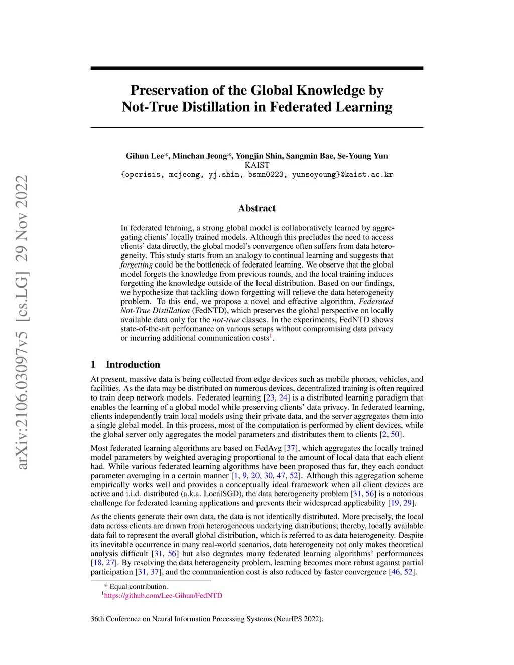 In federated learning, a strong global model is collaboratively learned by aggregating clients' locally trained models. Although this precludes the need to access clients' data directly, the global model's convergence often suffers from data heterogeneity. This study starts from an analogy to continual learning and suggests that forgetting could be the bottleneck of federated learning. We observe that the global model forgets the knowledge from previous rounds, and the local training induces forgetting the knowledge outside of the local distribution. Based on our findings, we hypothesize that tackling down forgetting will relieve the data heterogeneity problem. To this end, we propose a novel and effective algorithm, Federated Not-True Distillation (FedNTD), which preserves the global perspective on locally available data only for the not-true classes. In the experiments, FedNTD shows state-of-the-art performance on various setups without compromising data privacy or incurring additional communication costs.