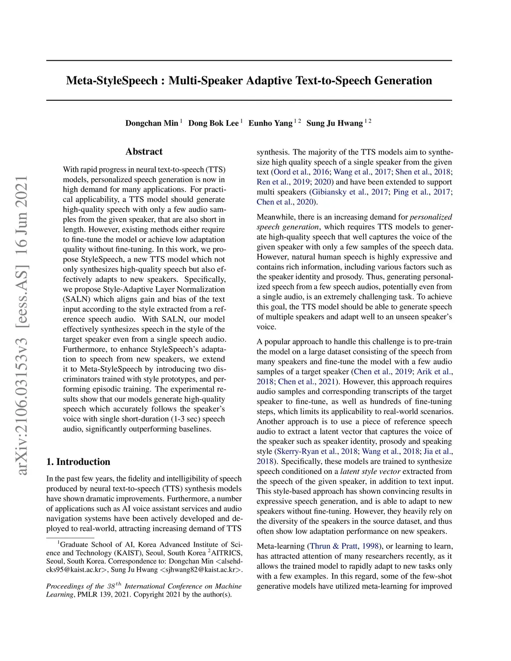 Meta-StyleSpeech : Multi-Speaker Adaptive Text-to-Speech Generation