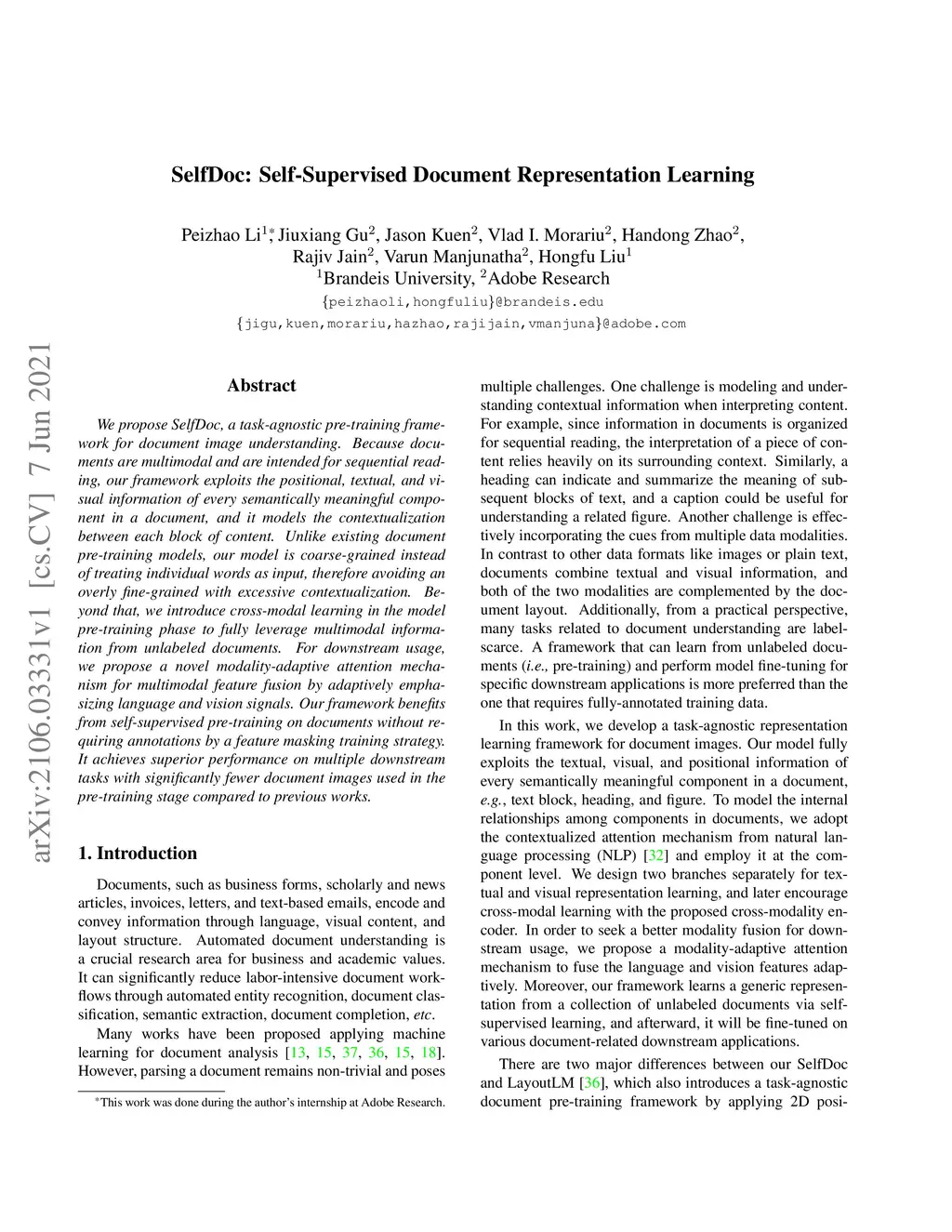 SelfDoc: Self-Supervised Document Representation Learning