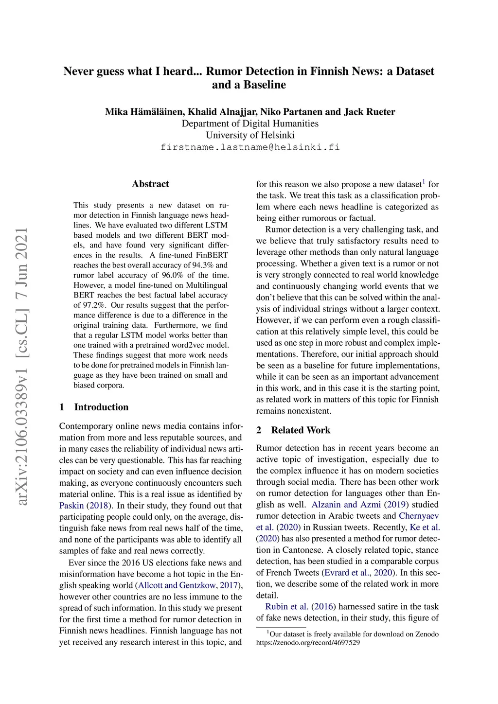 Never guess what I heard... Rumor Detection in Finnish News: a Dataset