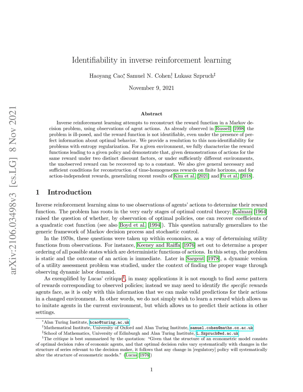 Inverse reinforcement learning attempts to reconstruct the reward function in a Markov decision problem, using observations of agent actions. As already observed in Russell [1998] the problem is ill-posed, and the reward function is not identifiable, even under the presence of perfect information about optimal behavior. We provide a resolution to this non-identifiability for problems with entropy regularization. For a given environment, we fully characterize the reward functions leading to a given policy and demonstrate that, given demonstrations of actions for the same reward under two distinct discount factors, or under sufficiently different environments, the unobserved reward can be recovered up to a constant. We also give general necessary and sufficient conditions for reconstruction of time-homogeneous rewards on finite horizons, and for action-independent rewards, generalizing recent results of Kim et al. [2021] and Fu et al. [2018].