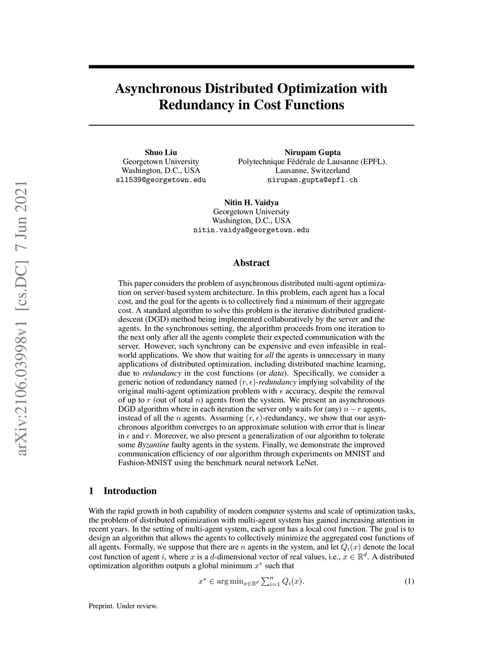 This paper considers the problem of asynchronous distributed multi-agent optimization on server-based system architecture. In this problem, each agent has a local cost, and the goal for the agents is to collectively find a minimum of their aggregate cost. A standard algorithm to solve this problem is the iterative distributed gradient-descent (DGD) method being implemented collaboratively by the server and the agents. In the synchronous setting, the algorithm proceeds from one iteration to the next only after all the agents complete their expected communication with the server. However, such synchrony can be expensive and even infeasible in real-world applications. We show that waiting for all the agents is unnecessary in many applications of distributed optimization, including distributed machine learning, due to redundancy in the cost functions (or {\em data}). Specifically, we consider a generic notion of redundancy named -redundancy implying solvability of the original multi-agent optimization problem with accuracy, despite the removal of up to (out of total ) agents from the system. We present an asynchronous DGD algorithm where in each iteration the server only waits for (any) agents, instead of all the agents. Assuming -redundancy, we show that our asynchronous algorithm converges to an approximate solution with error that is linear in and . Moreover, we also present a generalization of our algorithm to tolerate some Byzantine faulty agents in the system. Finally, we demonstrate the improved communication efficiency of our algorithm through experiments on MNIST and Fashion-MNIST using the benchmark neural network LeNet.