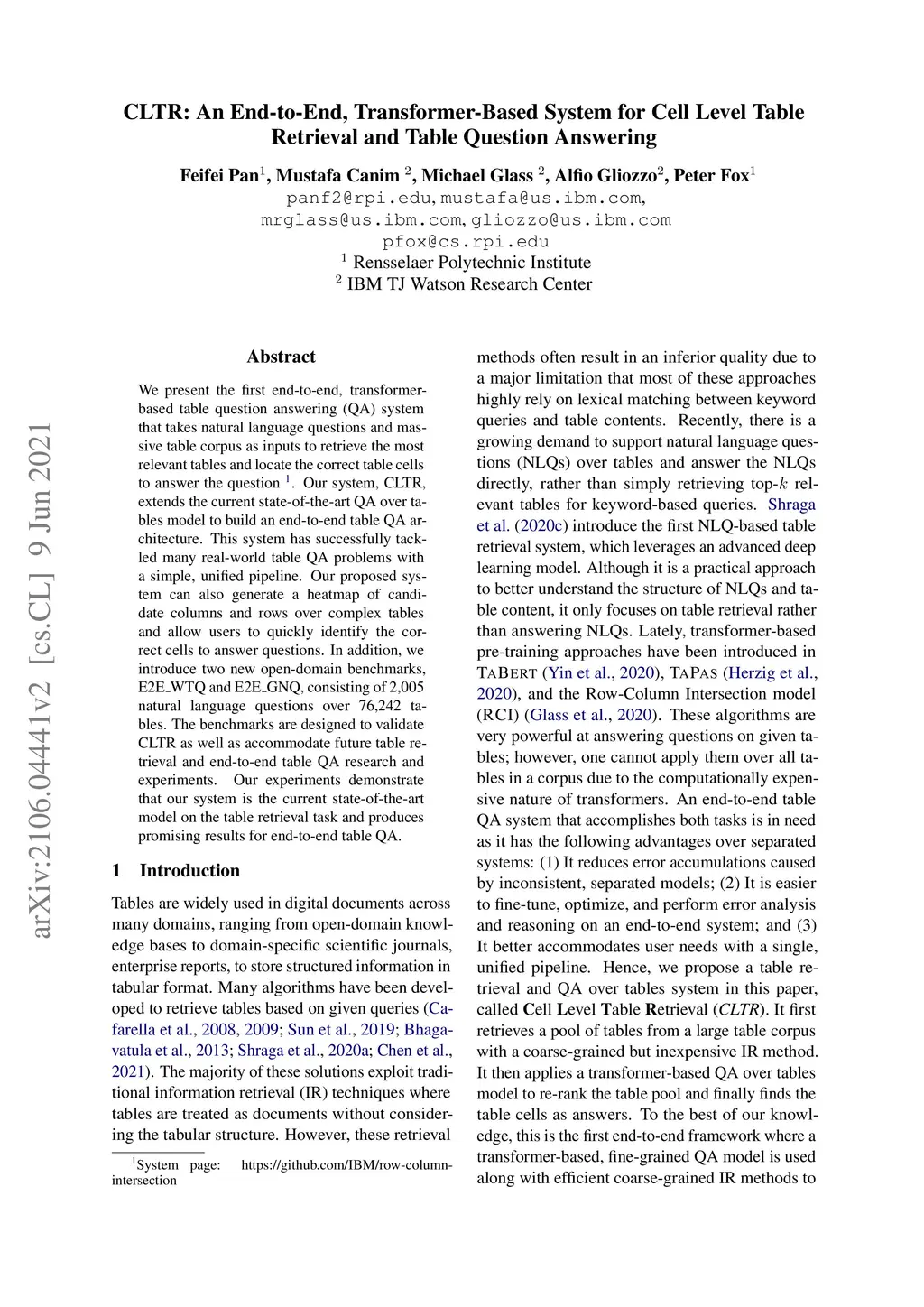 We present the first end-to-end, transformer-based table question answering (QA) system that takes natural language questions and massive table corpus as inputs to retrieve the most relevant tables and locate the correct table cells to answer the question. Our system, CLTR, extends the current state-of-the-art QA over tables model to build an end-to-end table QA architecture. This system has successfully tackled many real-world table QA problems with a simple, unified pipeline. Our proposed system can also generate a heatmap of candidate columns and rows over complex tables and allow users to quickly identify the correct cells to answer questions. In addition, we introduce two new open-domain benchmarks, E2E_WTQ and E2E_GNQ, consisting of 2,005 natural language questions over 76,242 tables. The benchmarks are designed to validate CLTR as well as accommodate future table retrieval and end-to-end table QA research and experiments. Our experiments demonstrate that our system is the current state-of-the-art model on the table retrieval task and produces promising results for end-to-end table QA.