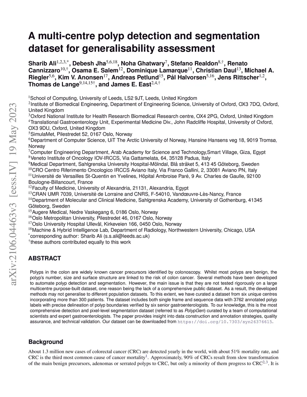 Polyps in the colon are widely known cancer precursors identified by colonoscopy. Whilst most polyps are benign, the polyp's number, size and surface structure are linked to the risk of colon cancer. Several methods have been developed to automate polyp detection and segmentation. However, the main issue is that they are not tested rigorously on a large multicentre purpose-built dataset, one reason being the lack of a comprehensive public dataset. As a result, the developed methods may not generalise to different population datasets. To this extent, we have curated a dataset from six unique centres incorporating more than 300 patients. The dataset includes both single frame and sequence data with 3762 annotated polyp labels with precise delineation of polyp boundaries verified by six senior gastroenterologists. To our knowledge, this is the most comprehensive detection and pixel-level segmentation dataset (referred to as \textit{PolypGen}) curated by a team of computational scientists and expert gastroenterologists. The paper provides insight into data construction and annotation strategies, quality assurance, and technical validation. Our dataset can be downloaded from \url{ https://doi.org/10.7303/syn26376615}.