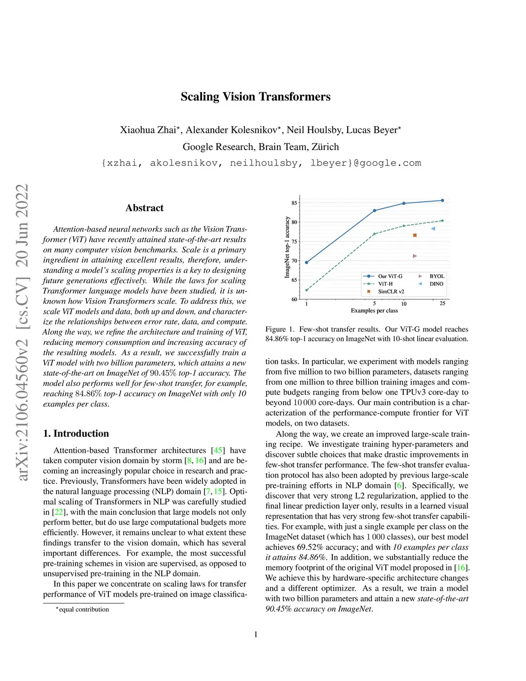 Attention-based neural networks such as the Vision Transformer (ViT) have recently attained state-of-the-art results on many computer vision benchmarks. Scale is a primary ingredient in attaining excellent results, therefore, understanding a model's scaling properties is a key to designing future generations effectively. While the laws for scaling Transformer language models have been studied, it is unknown how Vision Transformers scale. To address this, we scale ViT models and data, both up and down, and characterize the relationships between error rate, data, and compute. Along the way, we refine the architecture and training of ViT, reducing memory consumption and increasing accuracy of the resulting models. As a result, we successfully train a ViT model with two billion parameters, which attains a new state-of-the-art on ImageNet of 90.45% top-1 accuracy. The model also performs well for few-shot transfer, for example, reaching 84.86% top-1 accuracy on ImageNet with only 10 examples per class.
