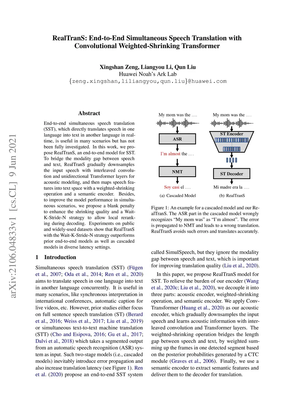 End-to-end simultaneous speech translation (SST), which directly translates speech in one language into text in another language in real-time, is useful in many scenarios but has not been fully investigated. In this work, we propose RealTranS, an end-to-end model for SST. To bridge the modality gap between speech and text, RealTranS gradually downsamples the input speech with interleaved convolution and unidirectional Transformer layers for acoustic modeling, and then maps speech features into text space with a weighted-shrinking operation and a semantic encoder. Besides, to improve the model performance in simultaneous scenarios, we propose a blank penalty to enhance the shrinking quality and a Wait-K-Stride-N strategy to allow local reranking during decoding. Experiments on public and widely-used datasets show that RealTranS with the Wait-K-Stride-N strategy outperforms prior end-to-end models as well as cascaded models in diverse latency settings.