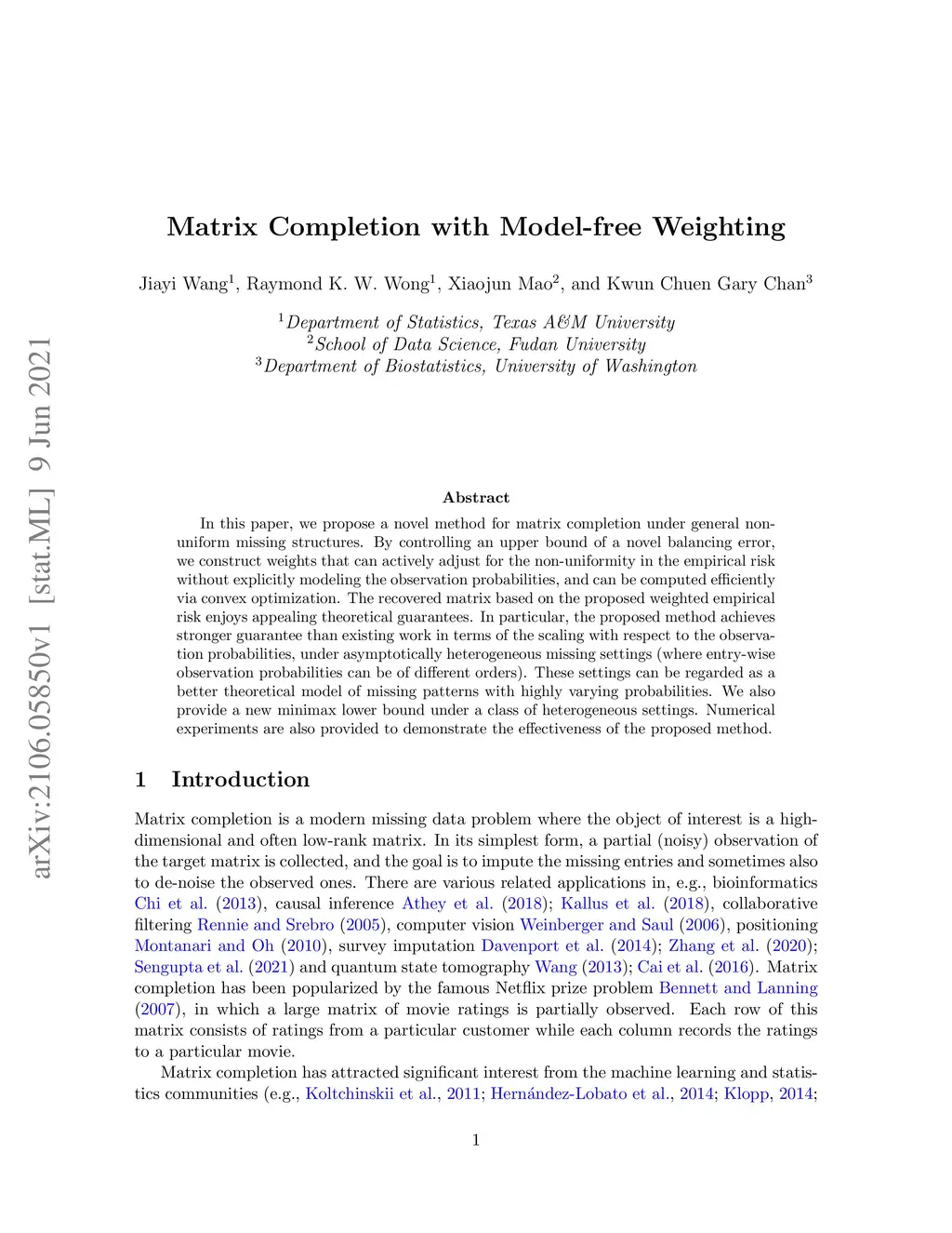 In this paper, we propose a novel method for matrix completion under general non-uniform missing structures. By controlling an upper bound of a novel balancing error, we construct weights that can actively adjust for the non-uniformity in the empirical risk without explicitly modeling the observation probabilities, and can be computed efficiently via convex optimization. The recovered matrix based on the proposed weighted empirical risk enjoys appealing theoretical guarantees. In particular, the proposed method achieves a stronger guarantee than existing work in terms of the scaling with respect to the observation probabilities, under asymptotically heterogeneous missing settings (where entry-wise observation probabilities can be of different orders). These settings can be regarded as a better theoretical model of missing patterns with highly varying probabilities. We also provide a new minimax lower bound under a class of heterogeneous settings. Numerical experiments are also provided to demonstrate the effectiveness of the proposed method.