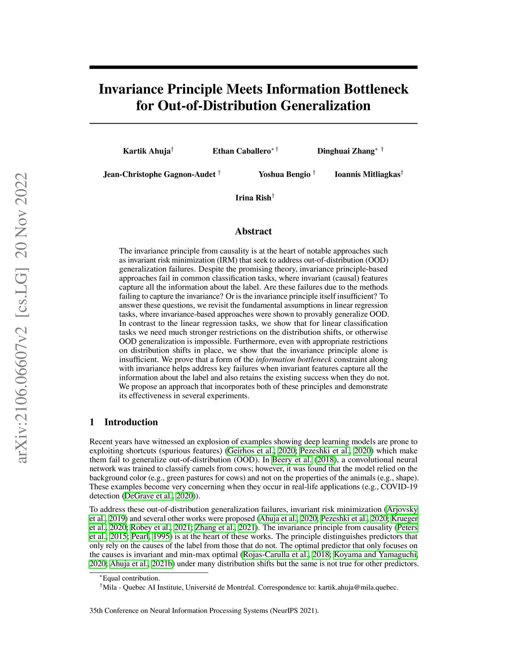 The invariance principle from causality is at the heart of notable approaches such as invariant risk minimization (IRM) that seek to address out-of-distribution (OOD) generalization failures. Despite the promising theory, invariance principle-based approaches fail in common classification tasks, where invariant (causal) features capture all the information about the label. Are these failures due to the methods failing to capture the invariance? Or is the invariance principle itself insufficient? To answer these questions, we revisit the fundamental assumptions in linear regression tasks, where invariance-based approaches were shown to provably generalize OOD. In contrast to the linear regression tasks, we show that for linear classification tasks we need much stronger restrictions on the distribution shifts, or otherwise OOD generalization is impossible. Furthermore, even with appropriate restrictions on distribution shifts in place, we show that the invariance principle alone is insufficient. We prove that a form of the information bottleneck constraint along with invariance helps address key failures when invariant features capture all the information about the label and also retains the existing success when they do not. We propose an approach that incorporates both of these principles and demonstrate its effectiveness in several experiments.