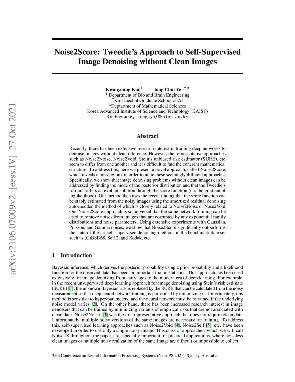 Recently, there has been extensive research interest in training deep networks to denoise images without clean reference. However, the representative approaches such as Noise2Noise, Noise2Void, Stein's unbiased risk estimator (SURE), etc. seem to differ from one another and it is difficult to find the coherent mathematical structure. To address this, here we present a novel approach, called Noise2Score, which reveals a missing link in order to unite these seemingly different approaches. Specifically, we show that image denoising problems without clean images can be addressed by finding the mode of the posterior distribution and that the Tweedie's formula offers an explicit solution through the score function (i.e. the gradient of log likelihood). Our method then uses the recent finding that the score function can be stably estimated from the noisy images using the amortized residual denoising autoencoder, the method of which is closely related to Noise2Noise or Nose2Void. Our Noise2Score approach is so universal that the same network training can be used to remove noises from images that are corrupted by any exponential family distributions and noise parameters. Using extensive experiments with Gaussian, Poisson, and Gamma noises, we show that Noise2Score significantly outperforms the state-of-the-art self-supervised denoising methods in the benchmark data set such as (C)BSD68, Set12, and Kodak, etc.