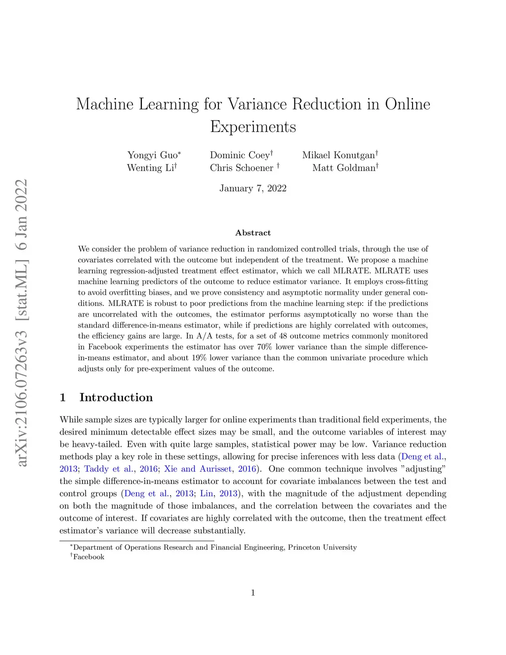 We consider the problem of variance reduction in randomized controlled trials, through the use of covariates correlated with the outcome but independent of the treatment. We propose a machine learning regression-adjusted treatment effect estimator, which we call MLRATE. MLRATE uses machine learning predictors of the outcome to reduce estimator variance. It employs cross-fitting to avoid overfitting biases, and we prove consistency and asymptotic normality under general conditions. MLRATE is robust to poor predictions from the machine learning step: if the predictions are uncorrelated with the outcomes, the estimator performs asymptotically no worse than the standard difference-in-means estimator, while if predictions are highly correlated with outcomes, the efficiency gains are large. In A/A tests, for a set of 48 outcome metrics commonly monitored in Facebook experiments the estimator has over 70% lower variance than the simple difference-in-means estimator, and about 19% lower variance than the common univariate procedure which adjusts only for pre-experiment values of the outcome.