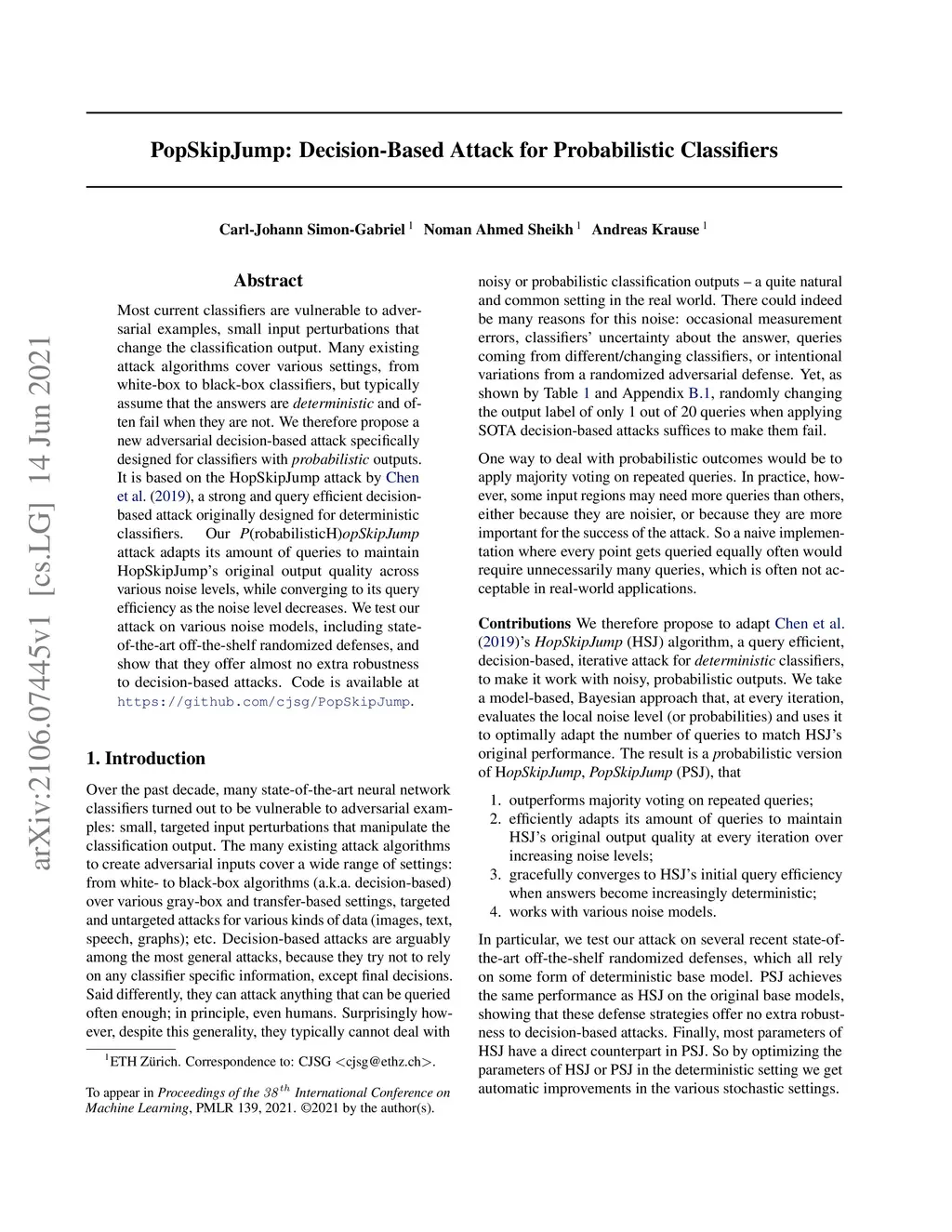 Most current classifiers are vulnerable to adversarial examples, small input perturbations that change the classification output. Many existing attack algorithms cover various settings, from white-box to black-box classifiers, but typically assume that the answers are deterministic and often fail when they are not. We therefore propose a new adversarial decision-based attack specifically designed for classifiers with probabilistic outputs. It is based on the HopSkipJump attack by Chen et al. (2019, arXiv:1904.02144v5 ), a strong and query efficient decision-based attack originally designed for deterministic classifiers. Our P(robabilisticH)opSkipJump attack adapts its amount of queries to maintain HopSkipJump's original output quality across various noise levels, while converging to its query efficiency as the noise level decreases. We test our attack on various noise models, including state-of-the-art off-the-shelf randomized defenses, and show that they offer almost no extra robustness to decision-based attacks. Code is available at https://github.com/cjsg/PopSkipJump .