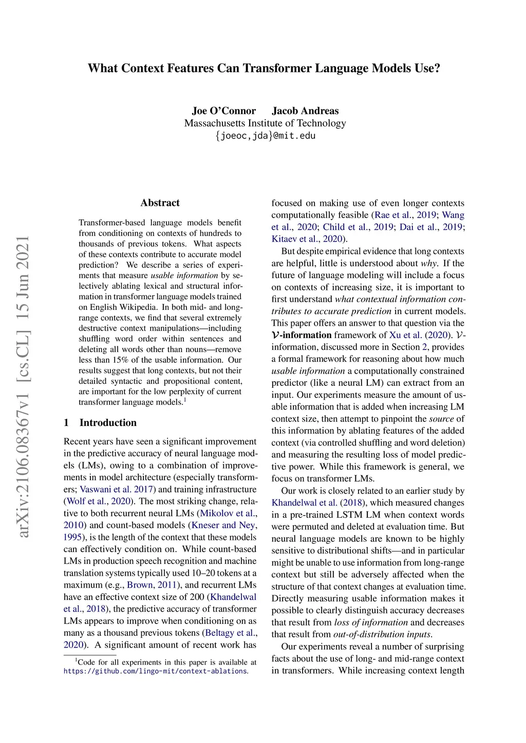 Transformer-based language models benefit from conditioning on contexts of hundreds to thousands of previous tokens. What aspects of these contexts contribute to accurate model prediction? We describe a series of experiments that measure usable information by selectively ablating lexical and structural information in transformer language models trained on English Wikipedia. In both mid- and long-range contexts, we find that several extremely destructive context manipulations -- including shuffling word order within sentences and deleting all words other than nouns -- remove less than 15% of the usable information. Our results suggest that long contexts, but not their detailed syntactic and propositional content, are important for the low perplexity of current transformer language models.