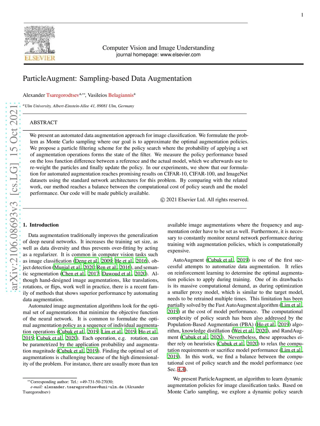 We present an automated data augmentation approach for image classification. We formulate the problem as Monte Carlo sampling where our goal is to approximate the optimal augmentation policies. We propose a particle filtering scheme for the policy search where the probability of applying a set of augmentation operations forms the state of the filter. We measure the policy performance based on the loss function difference between a reference and the actual model, which we afterwards use to re-weight the particles and finally update the policy. In our experiments, we show that our formulation for automated augmentation reaches promising results on CIFAR-10, CIFAR-100, and ImageNet datasets using the standard network architectures for this problem. By comparing with the related work, our method reaches a balance between the computational cost of policy search and the model performance. Our code will be made publicly available.