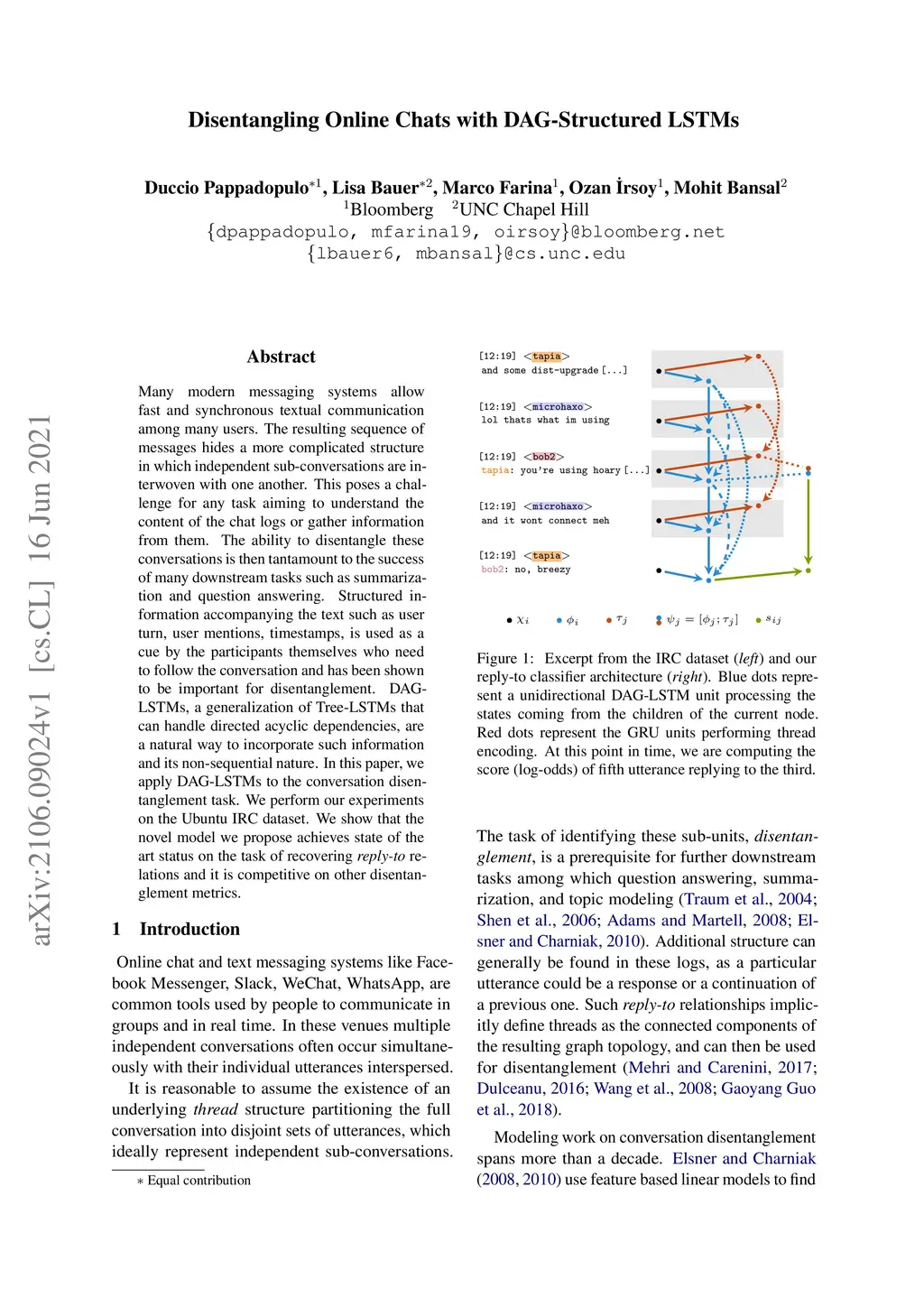 Many modern messaging systems allow fast and synchronous textual communication among many users. The resulting sequence of messages hides a more complicated structure in which independent sub-conversations are interwoven with one another. This poses a challenge for any task aiming to understand the content of the chat logs or gather information from them. The ability to disentangle these conversations is then tantamount to the success of many downstream tasks such as summarization and question answering. Structured information accompanying the text such as user turn, user mentions, timestamps, is used as a cue by the participants themselves who need to follow the conversation and has been shown to be important for disentanglement. DAG-LSTMs, a generalization of Tree-LSTMs that can handle directed acyclic dependencies, are a natural way to incorporate such information and its non-sequential nature. In this paper, we apply DAG-LSTMs to the conversation disentanglement task. We perform our experiments on the Ubuntu IRC dataset. We show that the novel model we propose achieves state of the art status on the task of recovering reply-to relations and it is competitive on other disentanglement metrics.